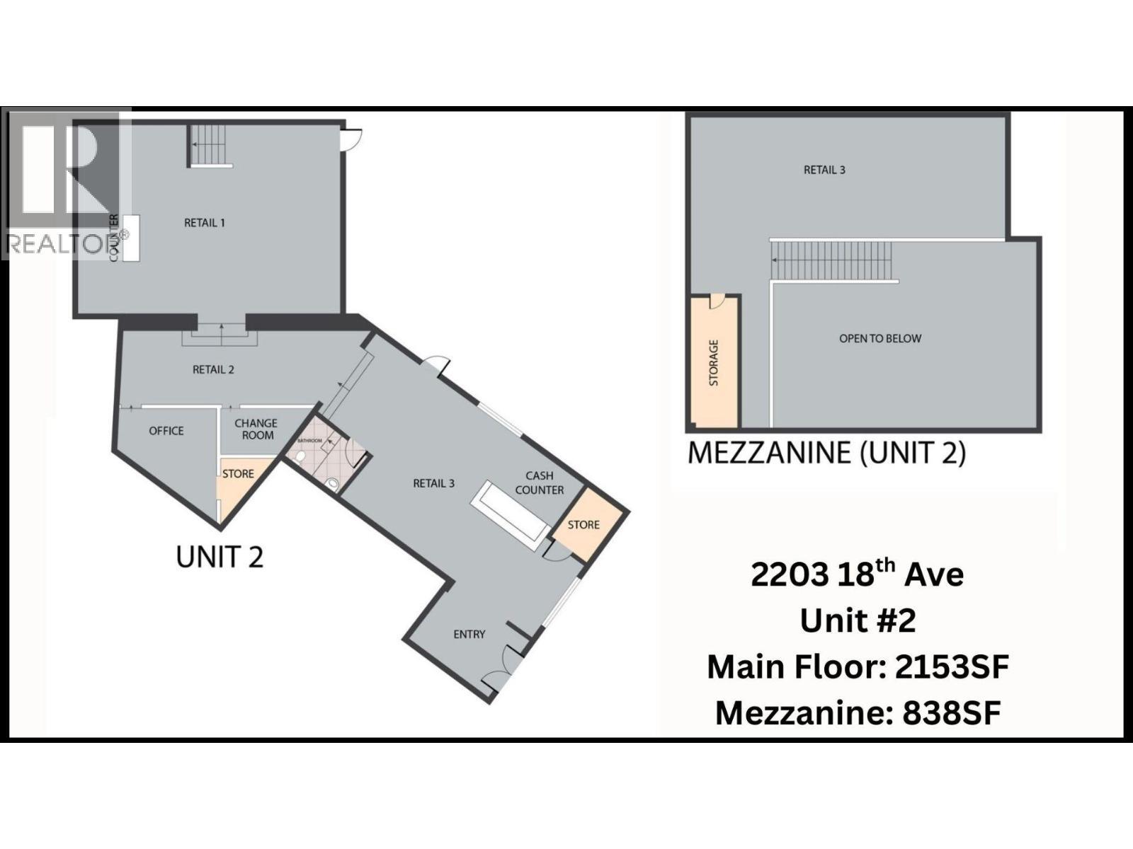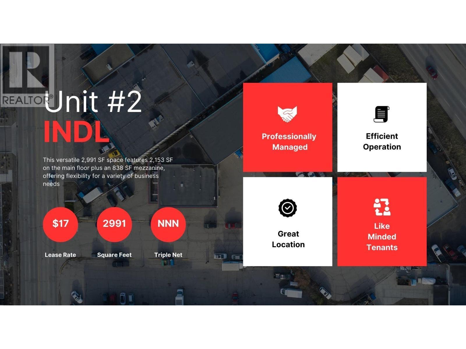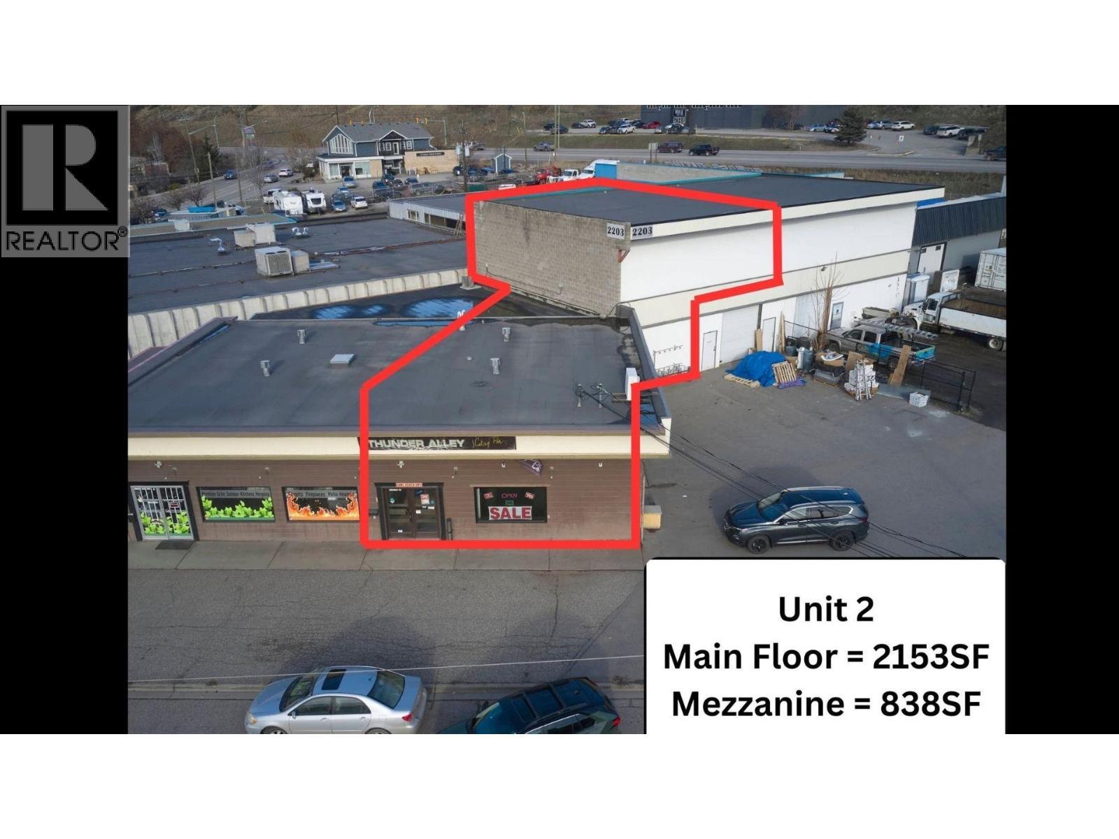 Commercial Space for Lease – Unit#2, 2203 18th Ave, Vernon, BC. Discover an exceptional leasing opportunity in a prime Vernon location. This versatile 2,991 SF space features 2,153 SF on the main floor plus an 838 SF mezzanine, offering flexibility for a variety of business needs. Conveniently located near major amenities—including restaurants, grocery stores, and a coffee shop right across the street, this property combines functionality with accessibility. Tenants and visitors will appreciate the ample on-site parking and easy access from surrounding main roads. Zoned Light Industrial, the unit accommodates a wide range of permitted uses, from light manufacturing and service-based businesses to warehouse and showroom operations. Lease Details: Rate: $17 per SF + Triple Net (NNN) / Total Area: 2,991 SF (2,153 SF main + 838 SF mezzanine) / Location: 2203 18th Avenue, Vernon, BC. This space offers the perfect balance of visibility, accessibility, and versatility—ideal for growing businesses seeking a well-located industrial-commercial property. (id:6769)
