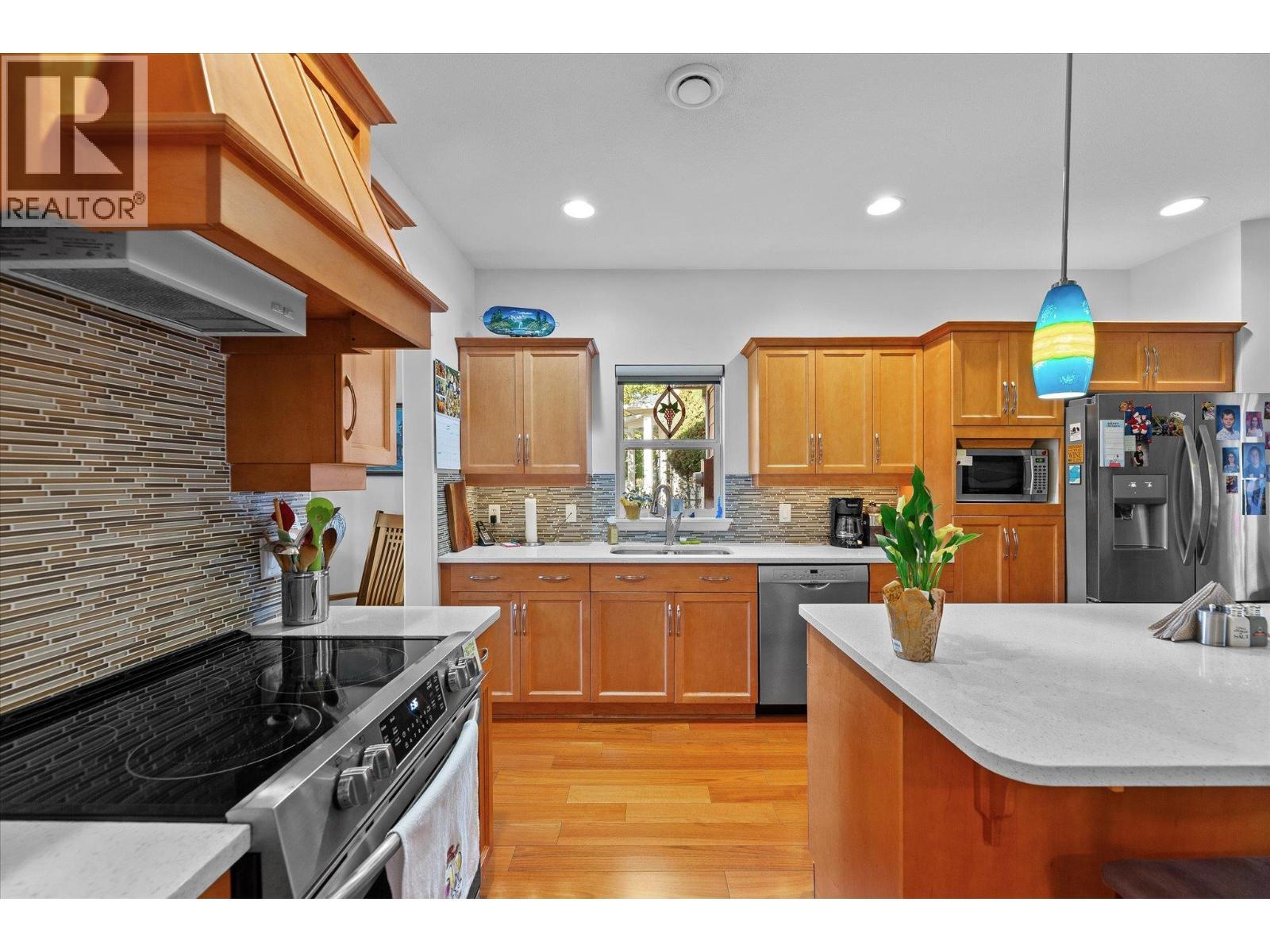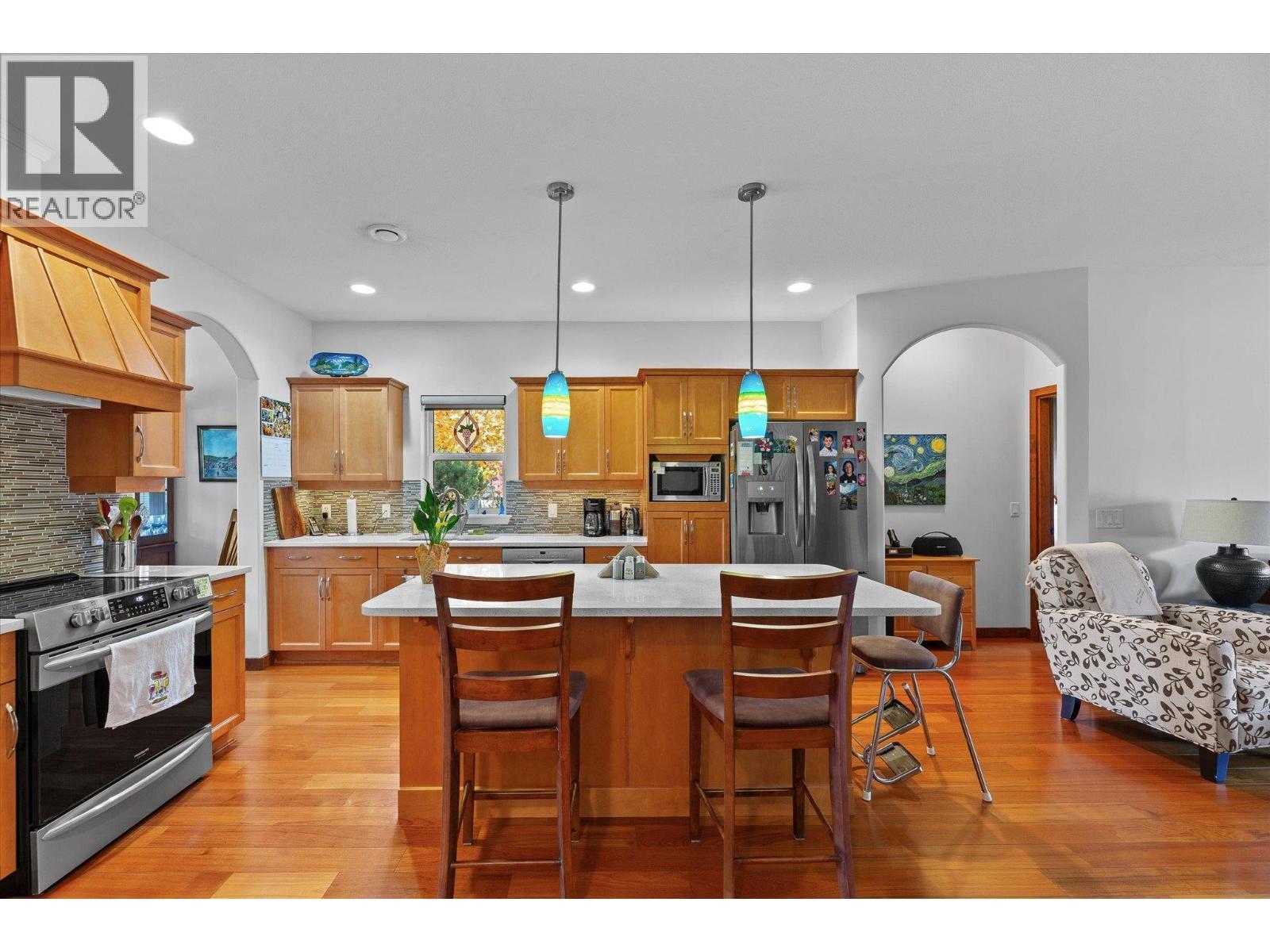 Experience the quintessential Kettle Valley lifestyle in this charming single-family 3 bed 2 bath home. Boasting perfect curb appeal with elegant stone detailing on the front terrace, this residence offers compact yet open-concept living. Check out the wine shrine to store and display your favorite Okanagan vintages! Featuring three comfortable bedrooms, 9 foot plus ceilings, island kitchen, quartz counters, hardwood floors, stainless steel appliances, real wood doors and trim and a wonderful covered terrace (18' x 9'), it provides ample outdoor enjoyment with additional lawn and garden space. The low-maintenance front yard complements a rear garden with complete privacy. This property presents an excellent alternative to strata living, offering control over your environment. A double detached garage (21' x 20') provides generous space for vehicles or hobbies. This meticulously maintained home offers a very livable floor plan, ideal for a single person, couple, or small family. All measurements from i-guide. Please verify if important. (id:6769)