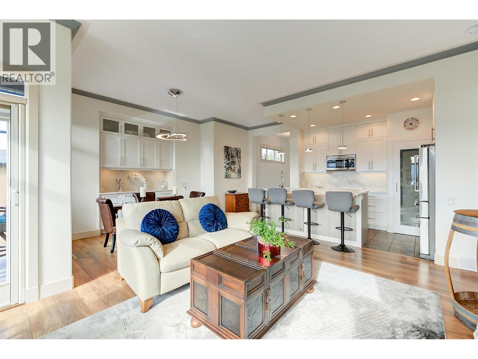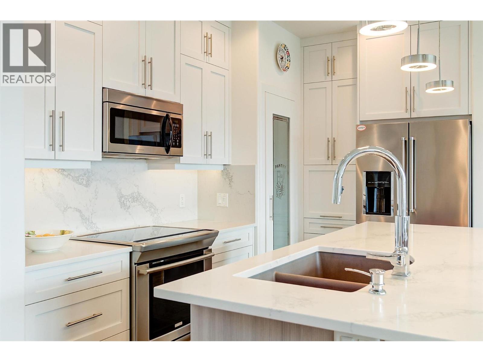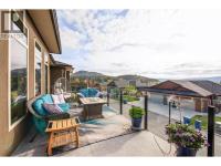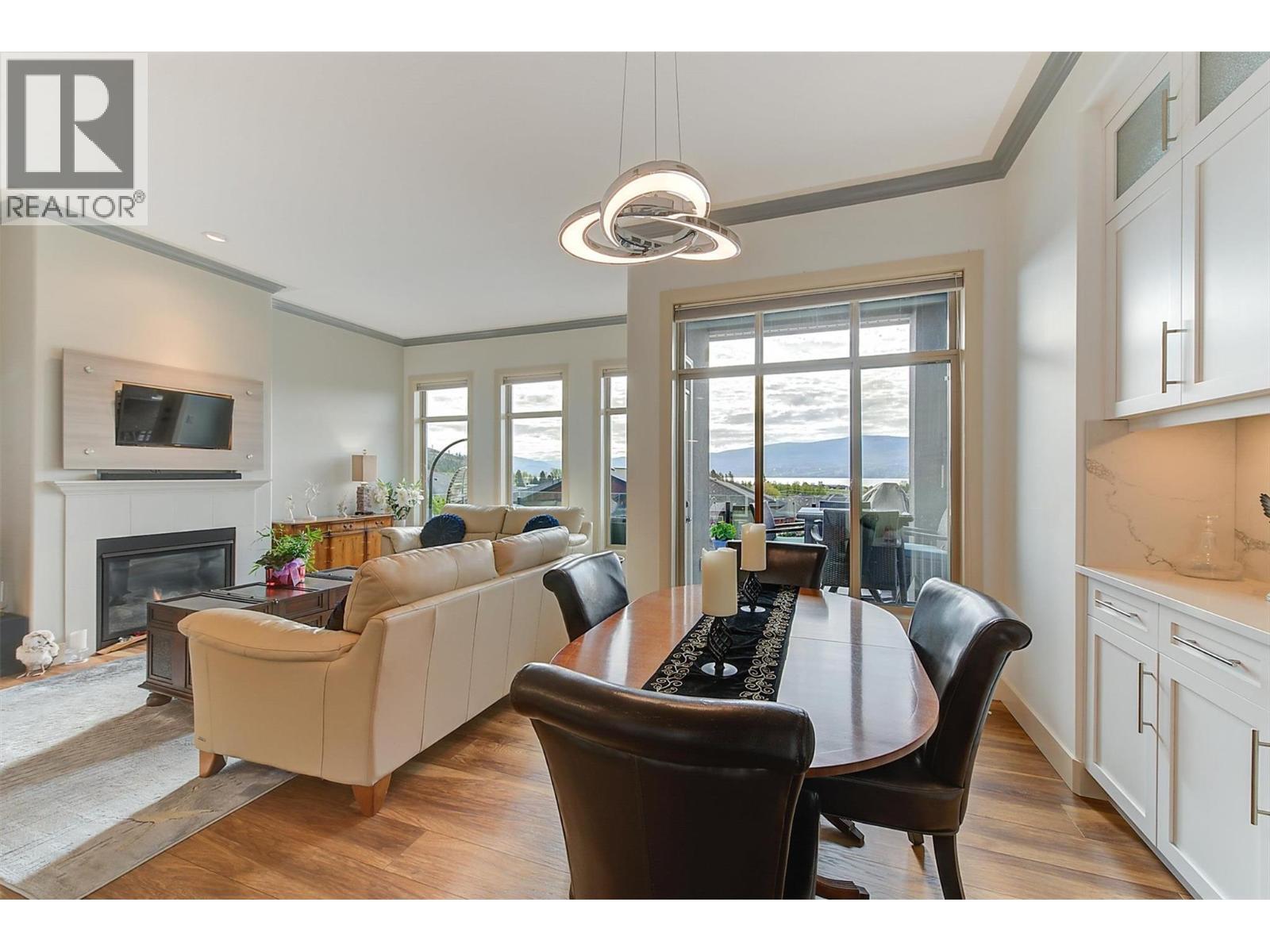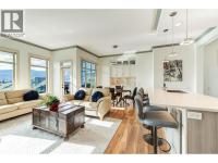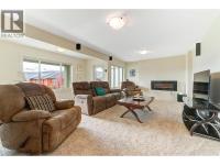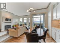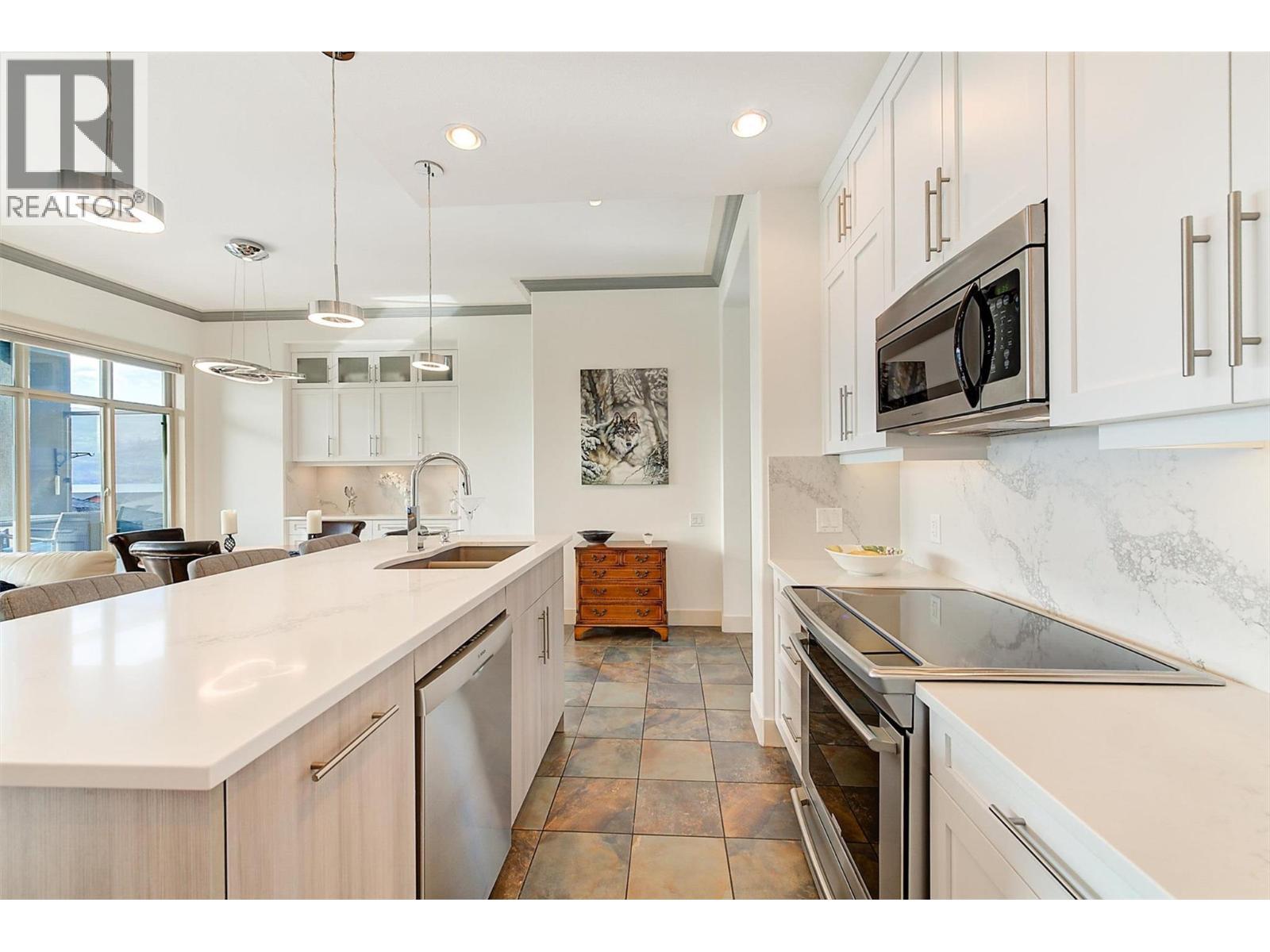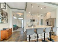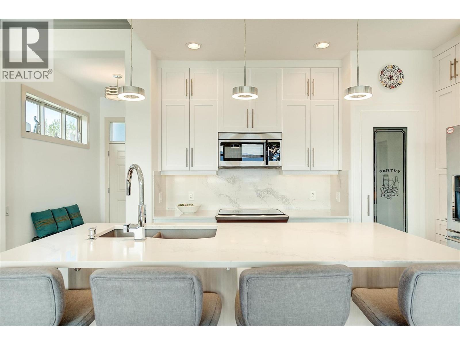 Welcome to this beautifully updated semi-detached townhome in the highly desirable Sonoma Pines community! Step into the stylish, modern custom kitchen featuring white shaker-style soft-close cabinets extended to the ceiling, sleek quartz countertops, stainless steel appliances, a convenient coffee station, a wave-activated Moen kitchen faucet, and updated lighting. The open-concept living room boasts newer laminate flooring, a cozy gas fireplace, and stunning lake views. Adjacent, the dining room includes custom built-in cabinetry and opens onto a spacious deck with topless glass railings—perfect for soaking in the panoramic lake views. The deck also comes equipped with gas hookups for BBQ. The bright and inviting primary bedroom features lake views, newer carpet, a walk-in closet, and a 4-piece ensuite with Corian counters. A second bedroom, full bathroom, and convenient laundry area complete the main floor layout. Downstairs, you'll find a spacious family room with an electric fireplace, a flex room ideal for a home office or gym, a third bedroom, another full bathroom, a large storage room, and access to a lower covered patio with hot tub hookup—perfect for year-round enjoyment. Additional highlights include a double garage, flat driveway, and low-maintenance living in a fantastic location close to golf, shopping, and Okanagan Lake. Sonoma Pines amenities include a clubhouse with gym, library, billiard room, and sizeable social room with a full kitchen available to rent. Secure RV parking is also available on-site. This is the perfect blend of comfort, style, and breathtaking views—don’t miss it. NO PTT, PREPAID LEASE. (id:6769)