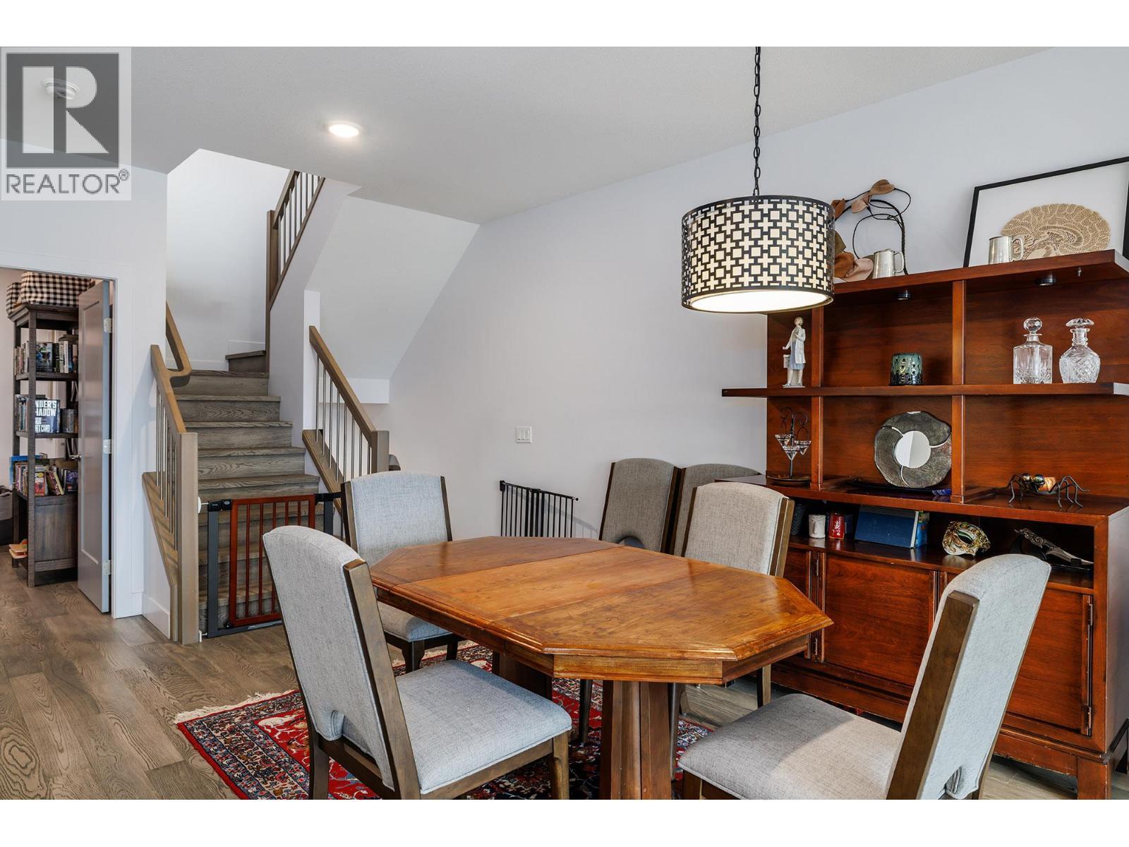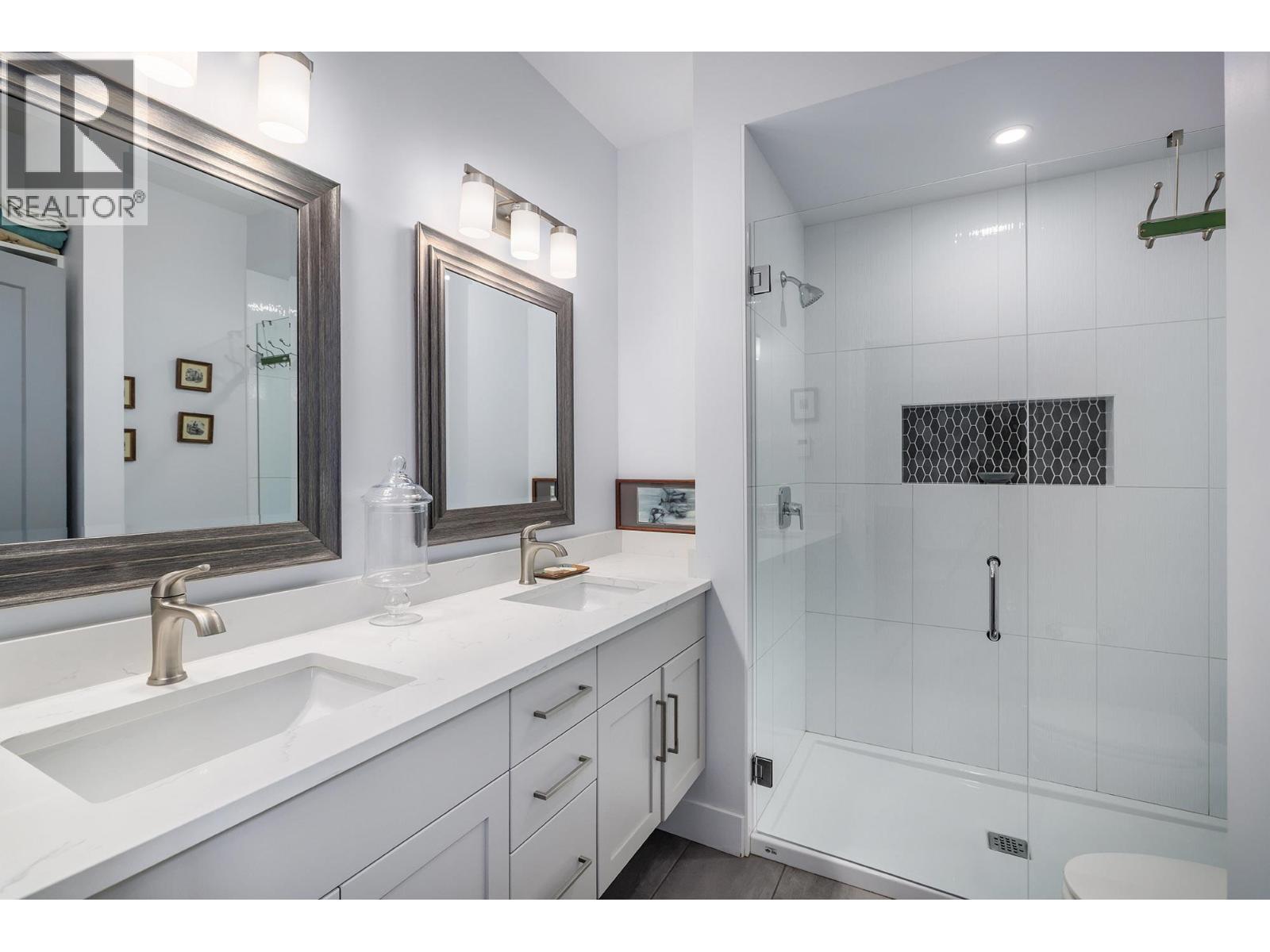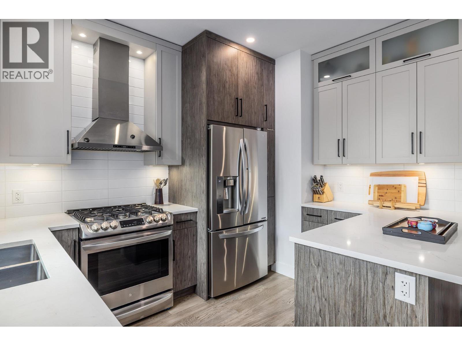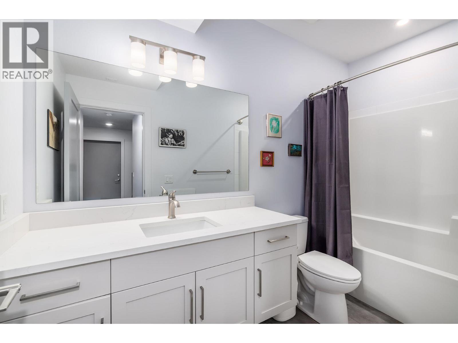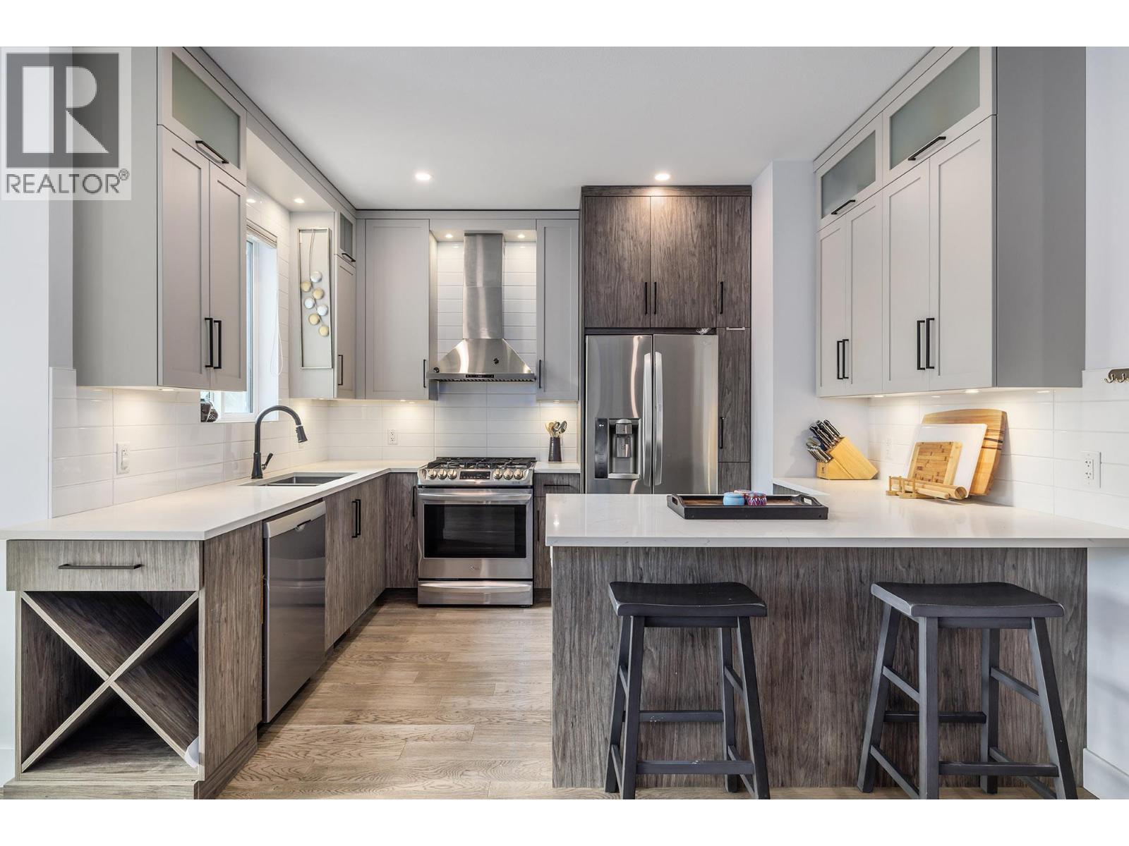 A thoughtfully designed two-level townhome in downtown Kelowna, blending modern style with everyday comfort. The entry level offers two bedrooms with built-in closets, a four-piece bathroom, dedicated laundry, and an attached single-car garage with polished concrete floors, plus an additional outdoor parking space. The main living level features a bright open-concept kitchen, dining, and living area with wide vinyl plank flooring throughout. The kitchen is finished with quartz countertops, ceiling-height cabinetry, a white tile backsplash, peninsula seating, undercabinet lighting, and stainless steel appliances, including an LG gas range and French door refrigerator. The primary bedroom is also located on this level and includes a walk-in closet and a spa-inspired ensuite with heated tile floors, floating vanity with two sinks, and a tiled walk-in shower. A stylish powder room completes the floor. Above, the expansive rooftop patio offers glass railings, city and mountain views, Duradek surfacing, a pergola for shade, and plenty of space for dining and lounging—perfect for summer evenings and entertaining. (id:6769)