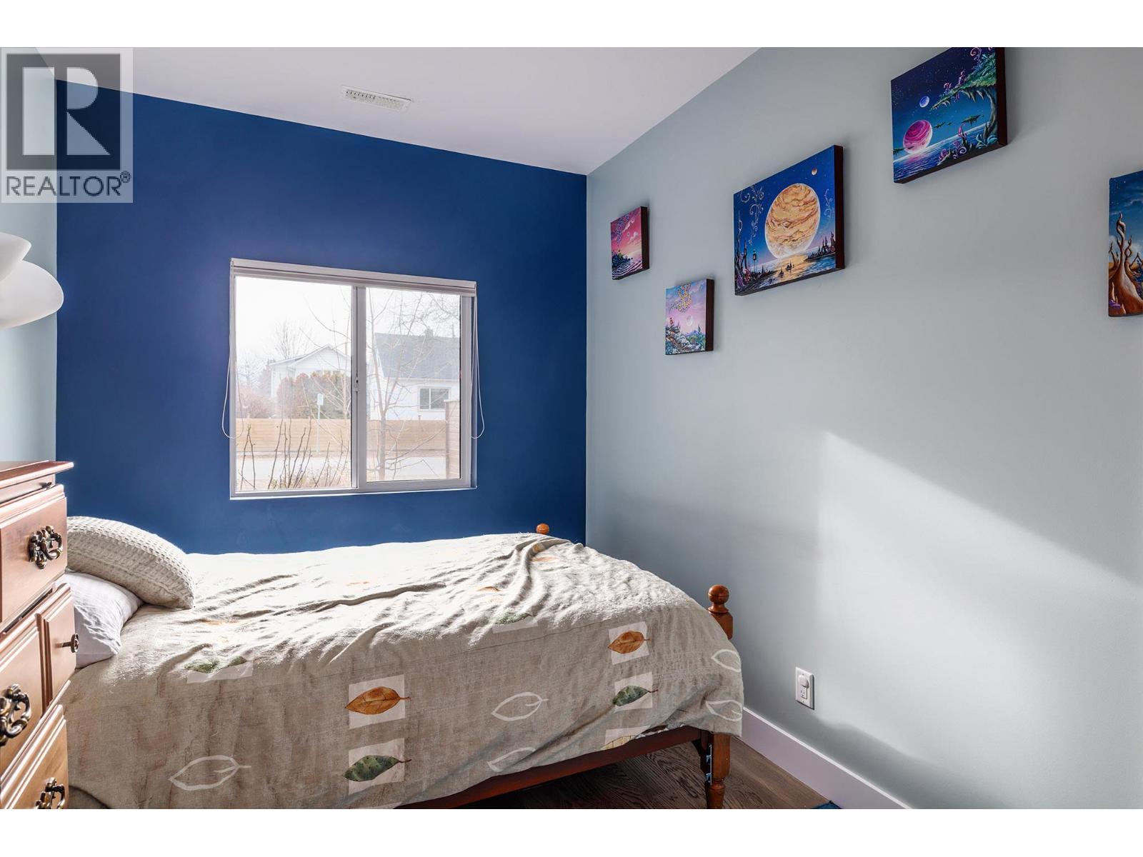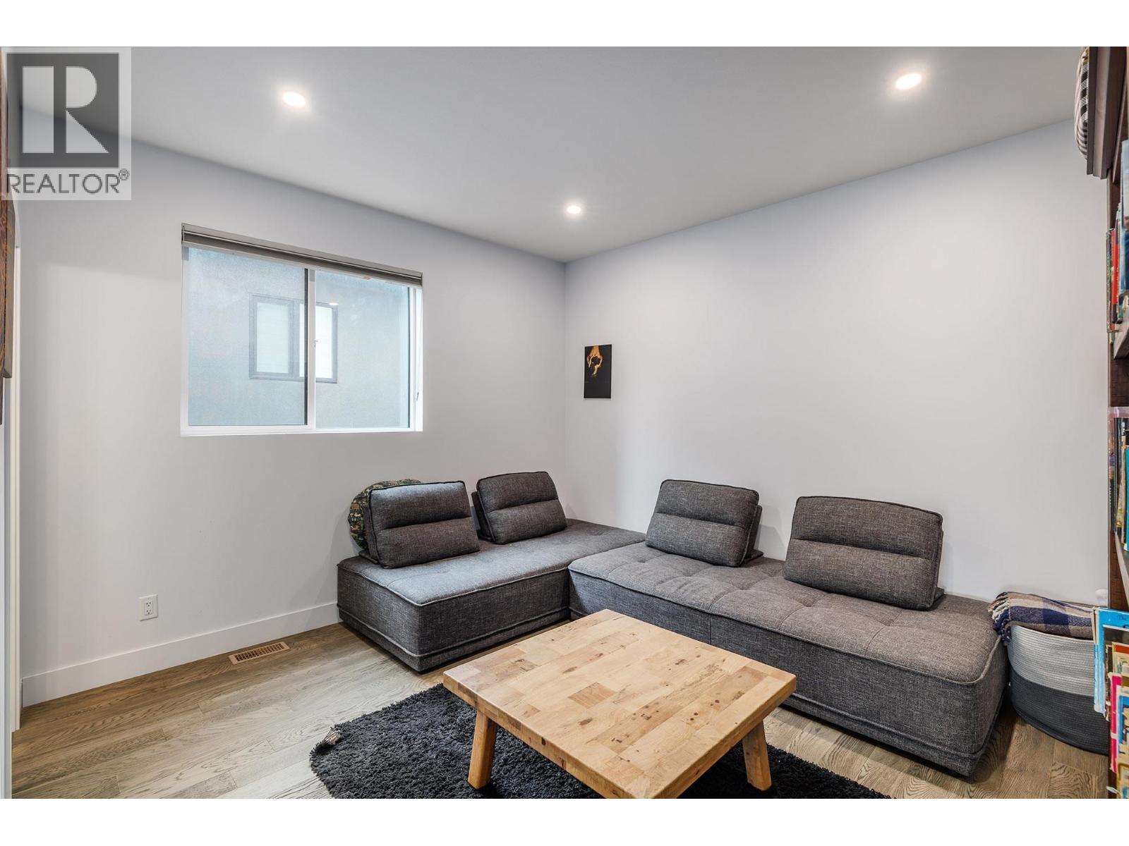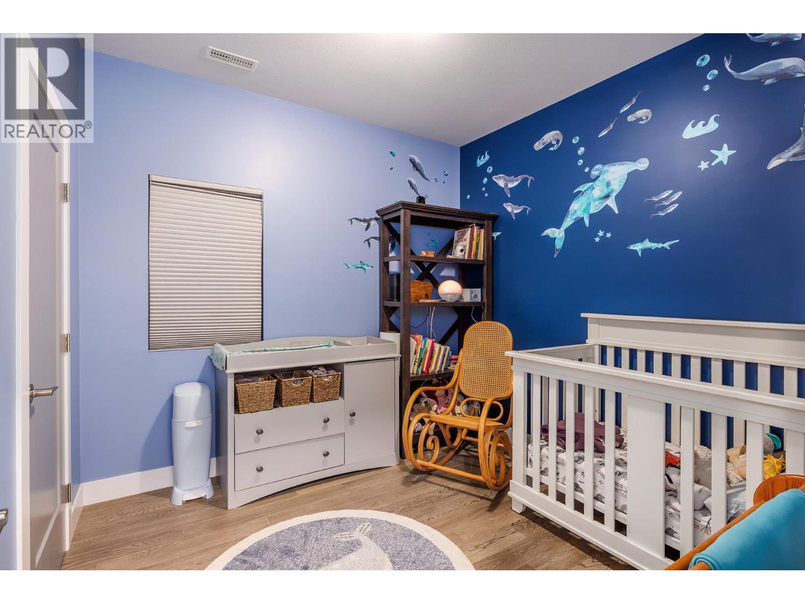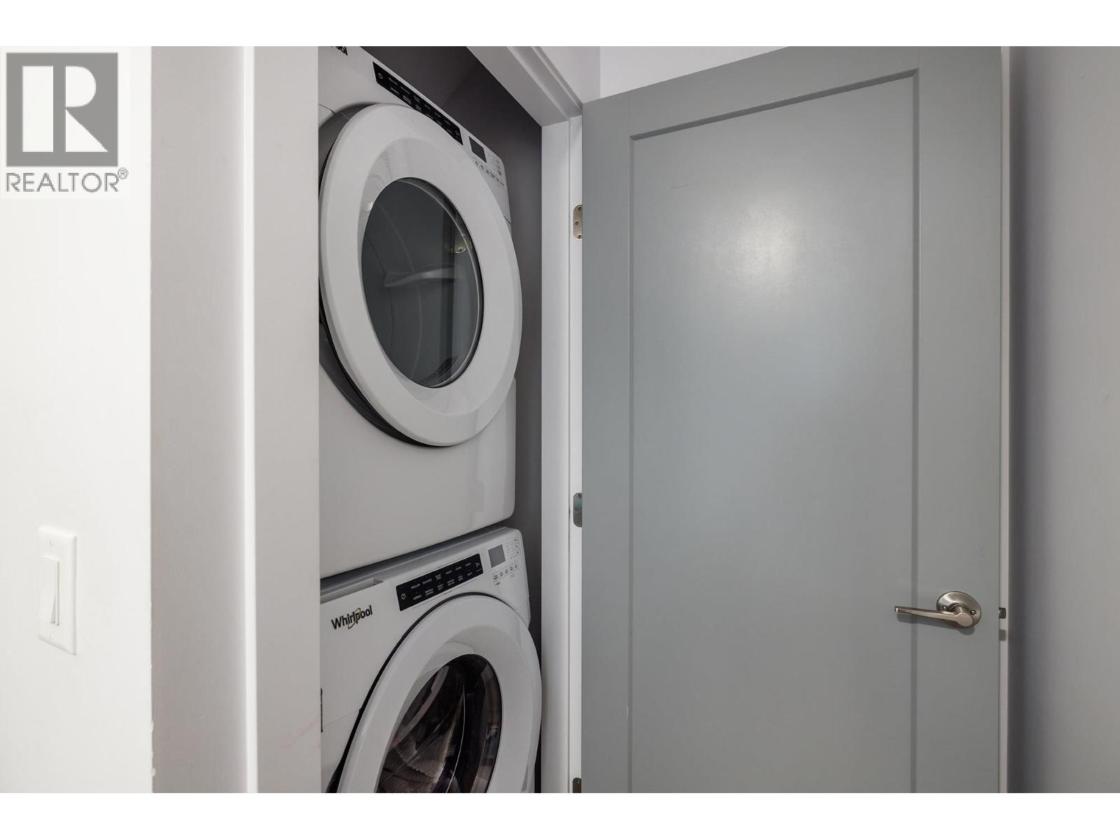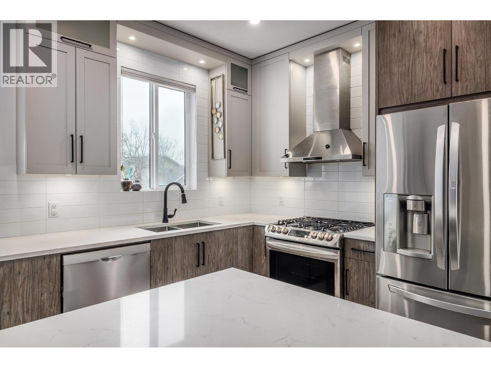 A thoughtfully designed two-level townhome in downtown Kelowna, blending modern style with everyday comfort. The entry level offers two bedrooms with built-in closets, a four-piece bathroom, dedicated laundry, and an attached single-car garage with polished concrete floors, plus an additional outdoor parking space. The main living level features a bright open-concept kitchen, dining, and living area with wide vinyl plank flooring throughout. The kitchen is finished with quartz countertops, ceiling-height cabinetry, a white tile backsplash, peninsula seating, undercabinet lighting, and stainless steel appliances, including an LG gas range and French door refrigerator. The primary bedroom is also located on this level and includes a walk-in closet and a spa-inspired ensuite with heated tile floors, floating vanity with two sinks, and a tiled walk-in shower. A stylish powder room completes the floor. Above, the expansive rooftop patio offers glass railings, city and mountain views, Duradek surfacing, a pergola for shade, and plenty of space for dining and lounging—perfect for summer evenings and entertaining. (id:6769)