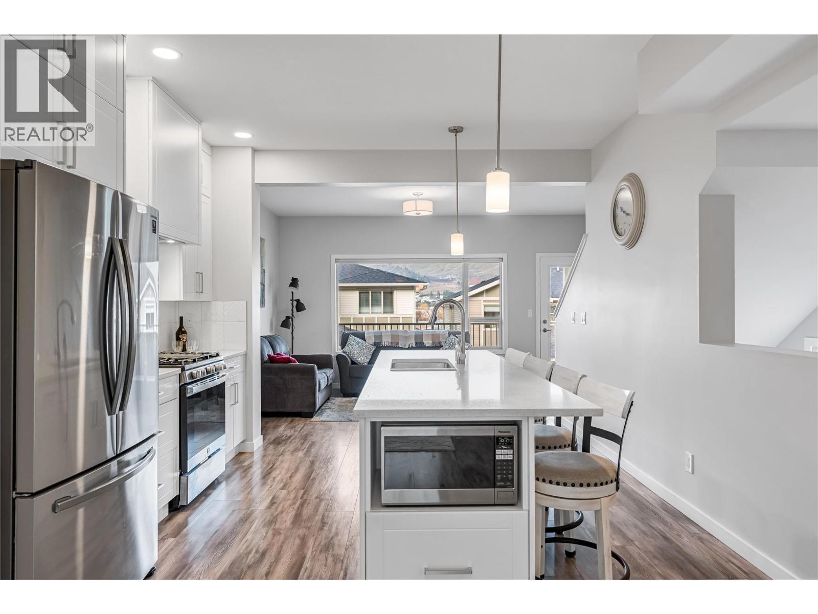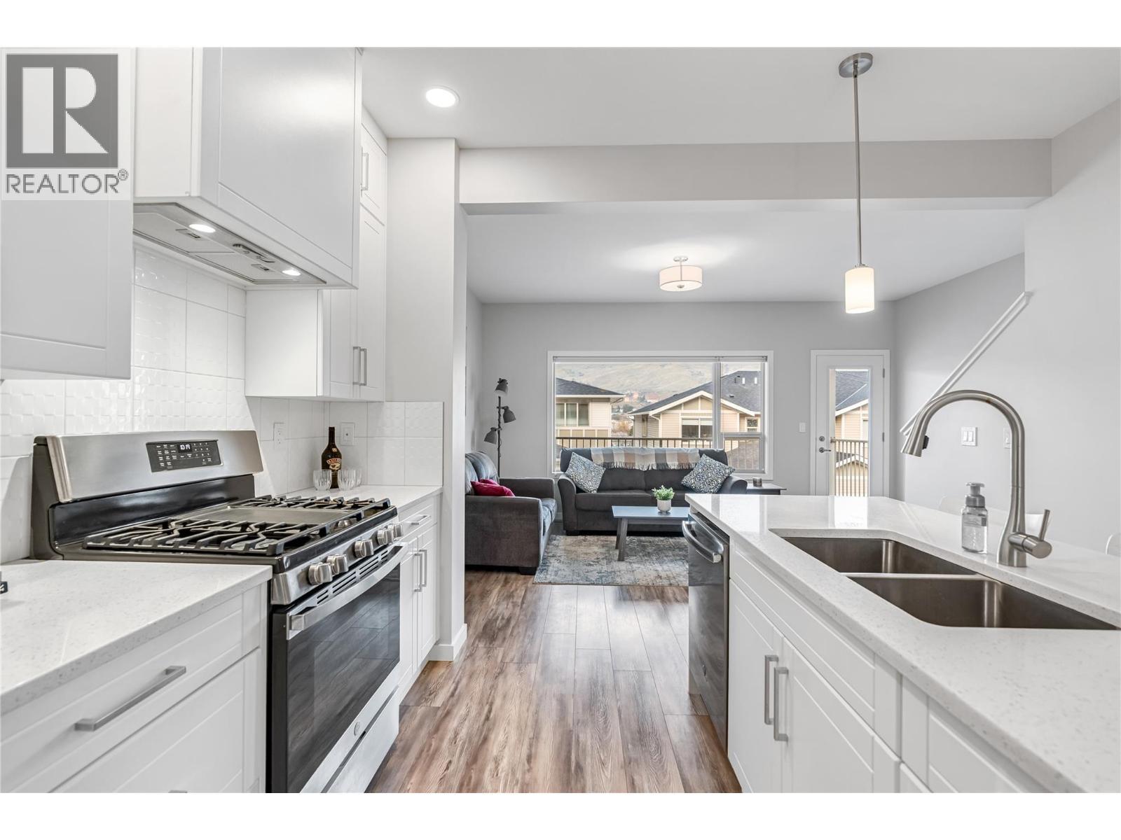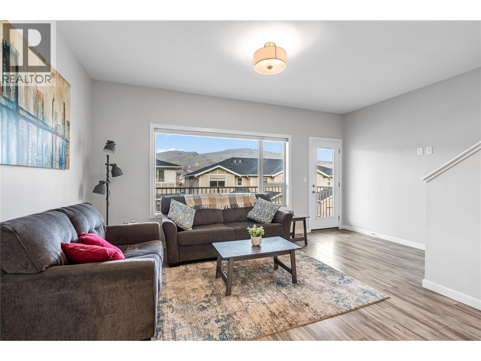 True end-unit! Thoughtfully designed and like new, this stylish townhouse is ideally located in the family friendly Mission Hill neighbourhood, just minutes from Okanagan Lake, two beaches, pickleball courts, and a nearby dog park, with excellent shopping and amenities close at hand. World-class golf courses are only a short 15-minute drive away. The main level welcomes you with high ceilings and an open-concept kitchen, dining, and living space that feels calm, bright, and inviting, enhanced by stainless steel appliances, quartz countertops and open valley views. A convenient powder room completes this floor, making it perfect for both everyday living and entertaining. Step onto your patio to enjoy a morning coffee or maybe a glass of wine from a local Okanagan Vineyard. Upstairs, the spacious primary retreat features a walk-in closet and a private ensuite, while a second bedroom also enjoys its own ensuite. Upstairs laundry adds everyday ease and functionality. Outside, the private backyard offers a covered patio, low-maintenance turf, and exceptional privacy ideal for relaxing or enjoying time with pets. A tandem garage provides secure storage for all your Okanagan lifestyle gear. Pet-friendly, move-in ready, and effortlessly livable. (id:6769)