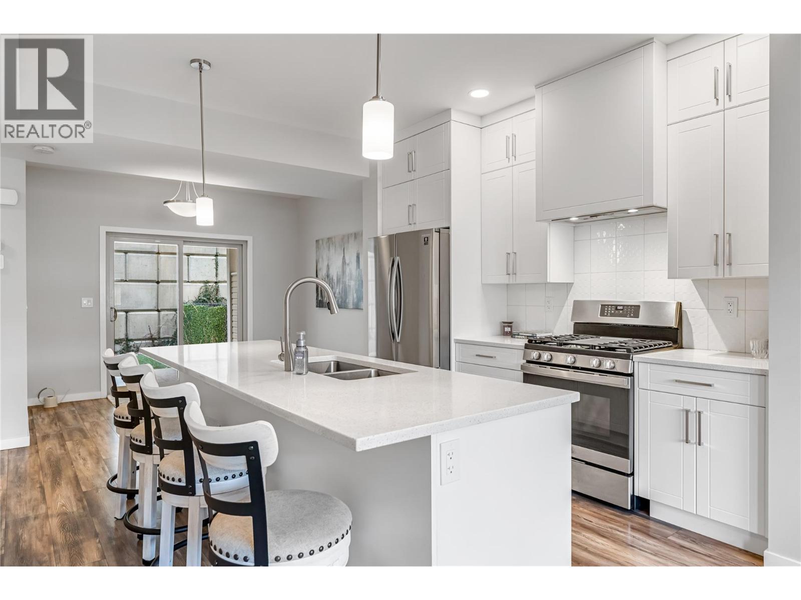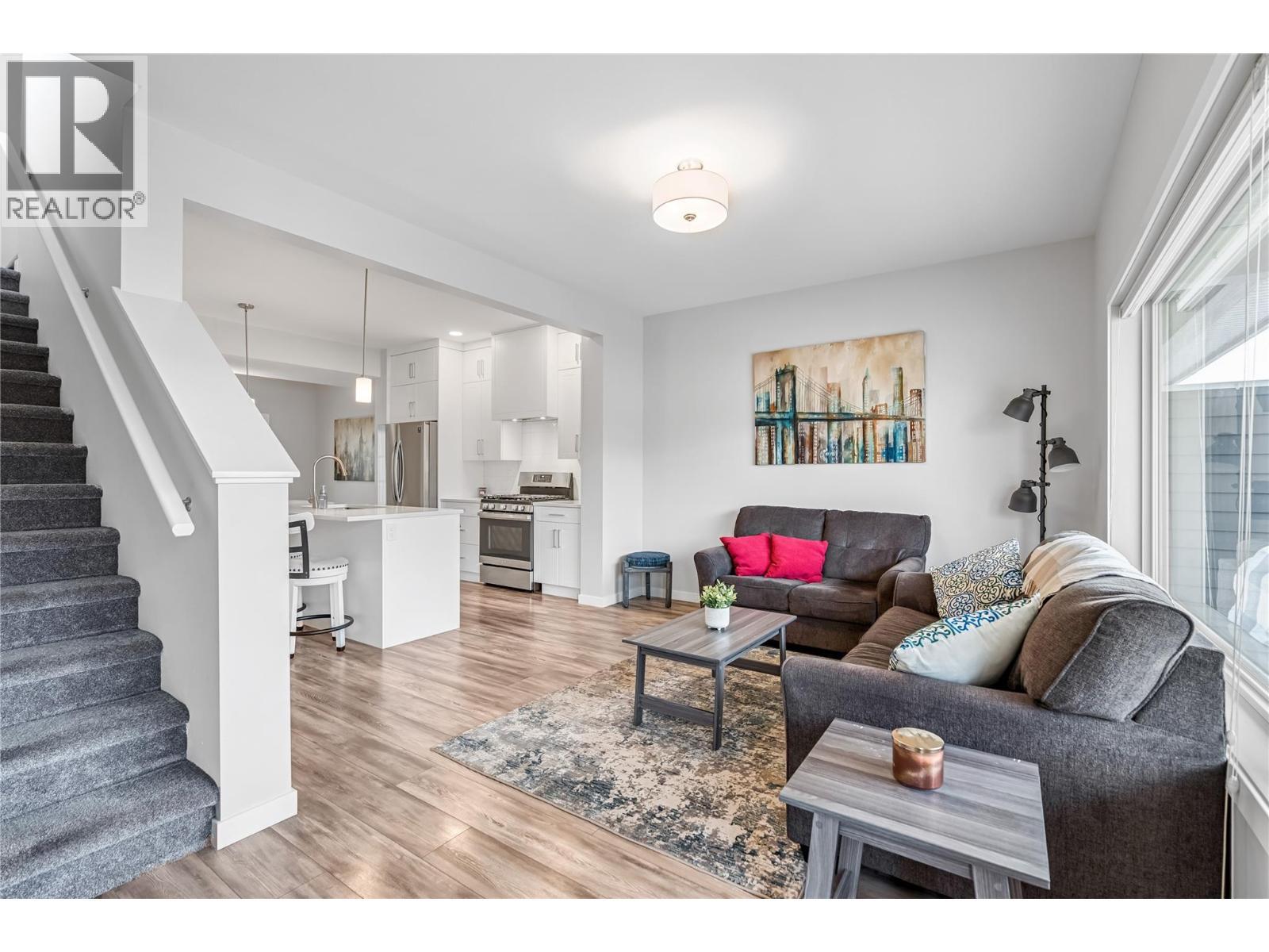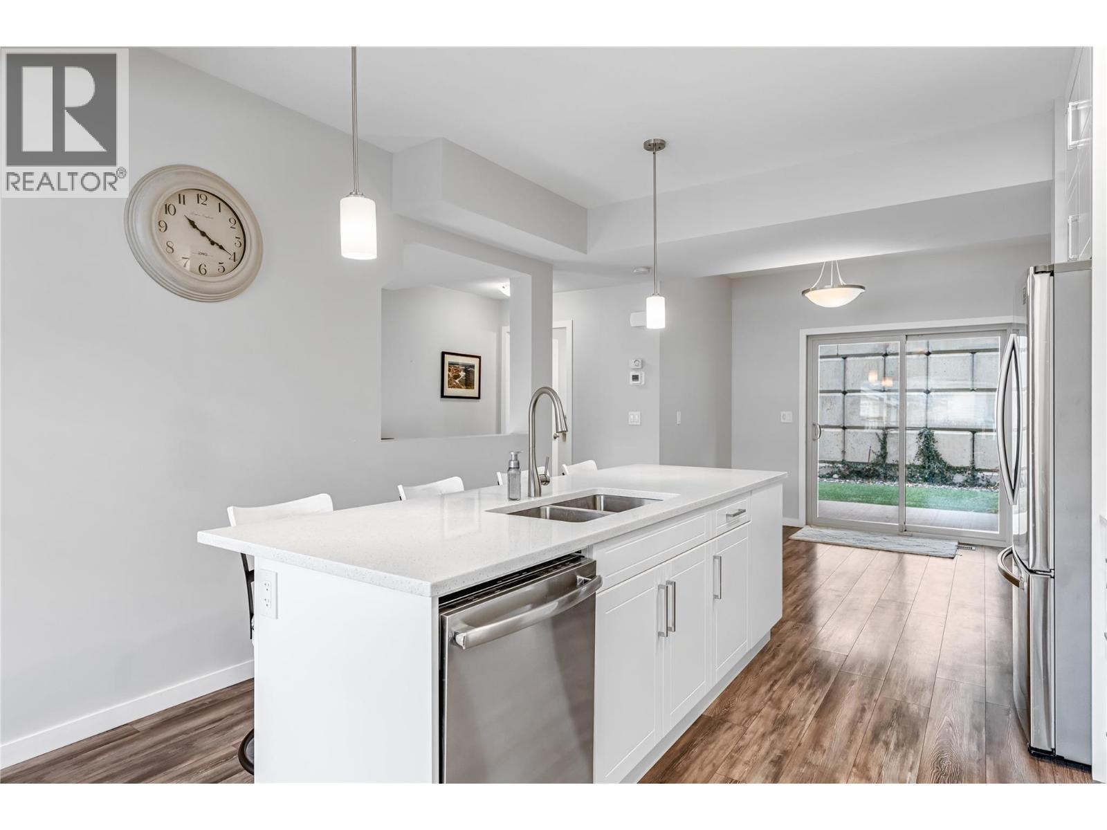 True end-unit! Thoughtfully designed and like new, this stylish townhouse is ideally located in the family friendly Mission Hill neighbourhood, just minutes from Okanagan Lake, two beaches, pickleball courts, and a nearby dog park, with excellent shopping and amenities close at hand. World-class golf courses are only a short 15-minute drive away. The main level welcomes you with high ceilings and an open-concept kitchen, dining, and living space that feels calm, bright, and inviting, enhanced by stainless steel appliances, quartz countertops and open valley views. A convenient powder room completes this floor, making it perfect for both everyday living and entertaining. Step onto your patio to enjoy a morning coffee or maybe a glass of wine from a local Okanagan Vineyard. Upstairs, the spacious primary retreat features a walk-in closet and a private ensuite, while a second bedroom also enjoys its own ensuite. Upstairs laundry adds everyday ease and functionality. Outside, the private backyard offers a covered patio, low-maintenance turf, and exceptional privacy ideal for relaxing or enjoying time with pets. A tandem garage provides secure storage for all your Okanagan lifestyle gear. Pet-friendly, move-in ready, and effortlessly livable. (id:6769)