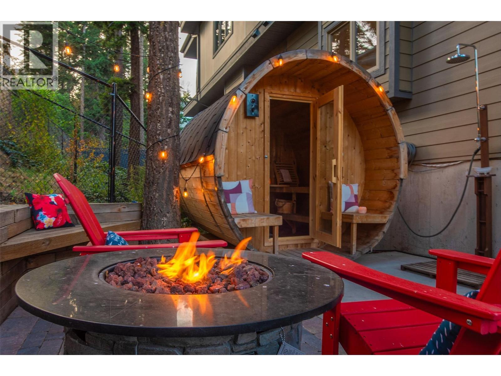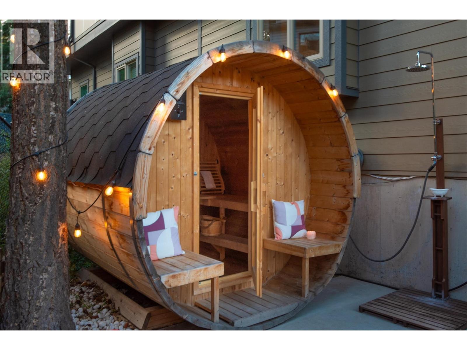 MASSIVE ROOFTOP PATIO, with unobstructed views of LAKE and MOUNTAINS. Rooftop HOT TUB and Rooftop GREENHOUSE included!! Personal gas-powered WINE BARREL SAUNA both dry or steam included! Outdoor shower for cold exposure after sauna session, personal spa experience at home! Upgrades include landscaping with built-in bench around fire pit and beautiful patio stone area. Unit has total of 4 beds & 4 baths! Only unit with NO CARPET, beautiful scratch-proof flooring. FINISHED WALK-OUT BASEMENT with PRIVATE ENTRANCE. HUGE bright kitchen with large island, modern quartz countertops, walk-in pantry, and beautiful cabinetry! OPEN CONCEPT living and dining room off kitchen with TWO fireplaces and high ceilings. Easily access BBQ, fire pit or sauna from quaint wrap around porch off kitchen to backyard. Oversized MASTER bedroom with WALK-IN closet, gorgeous ENSUITE BATHROOM with his and her sinks, private toilet room, and luxurious freestanding soaker tub! Backyard faces south, sun all day! Mature trees and lush vegetated hillside provide privacy, shade, and tranquility. Large 2 car GARAGE with built in cabinets and storage shelves. NO pet restrictions, dog pen, dog friendly community. Walking distance to Starbucks, yoga studio, Pub, Marina, Restaurants, local shops, etc. Easy access to paved bike and walking trail around Wood Lake with access to Okanagan Rail Trail, picnic area, beach, and off-leash dog park with beach, etc. (id:6769)