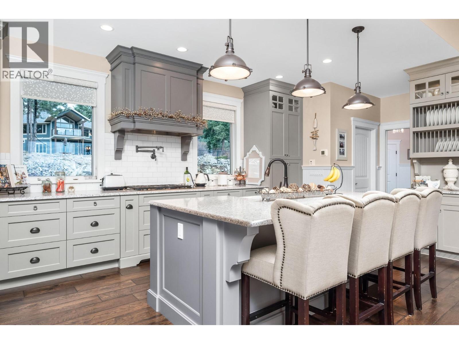 The perfect collaboration—when everything comes together: thoughtful design, elegant decor, supreme comfort, inspirational views, the pool, the patios, the four-car garage, and the theatre room! Located off a quiet lane, this home truly has it all—designed to maximize spectacular Okanagan Lake views and privacy. The level-entry main floor features a great room that seamlessly incorporates a dream kitchen with entertainment bar, a spacious dining area, and a gathering area centered around a classic gas fireplace. Nano doors open to the covered patio with summer kitchen and automated screens. Just steps away, the lower patio and heated saltwater pool await! The primary suite is set apart from the other two bedrooms, while guests enjoy a private suite complete with breakfast bar, full bath, and private deck. A fully equipped theatre room with wet bar and fireplace adds luxury and convenience. Additional features include two heating & cooling systems, instant hot water, hardwood floors, and elevated beamed ceilings. The lower garage is heated and comes with a workshop with 400lb hoist. Upper garage with pet wash. RV parking includes 30-amp service. Residents of Canadian Lakeview enjoy access to a private beach, complete with boat launch, dock, and bath/changing rooms. (id:6769)
