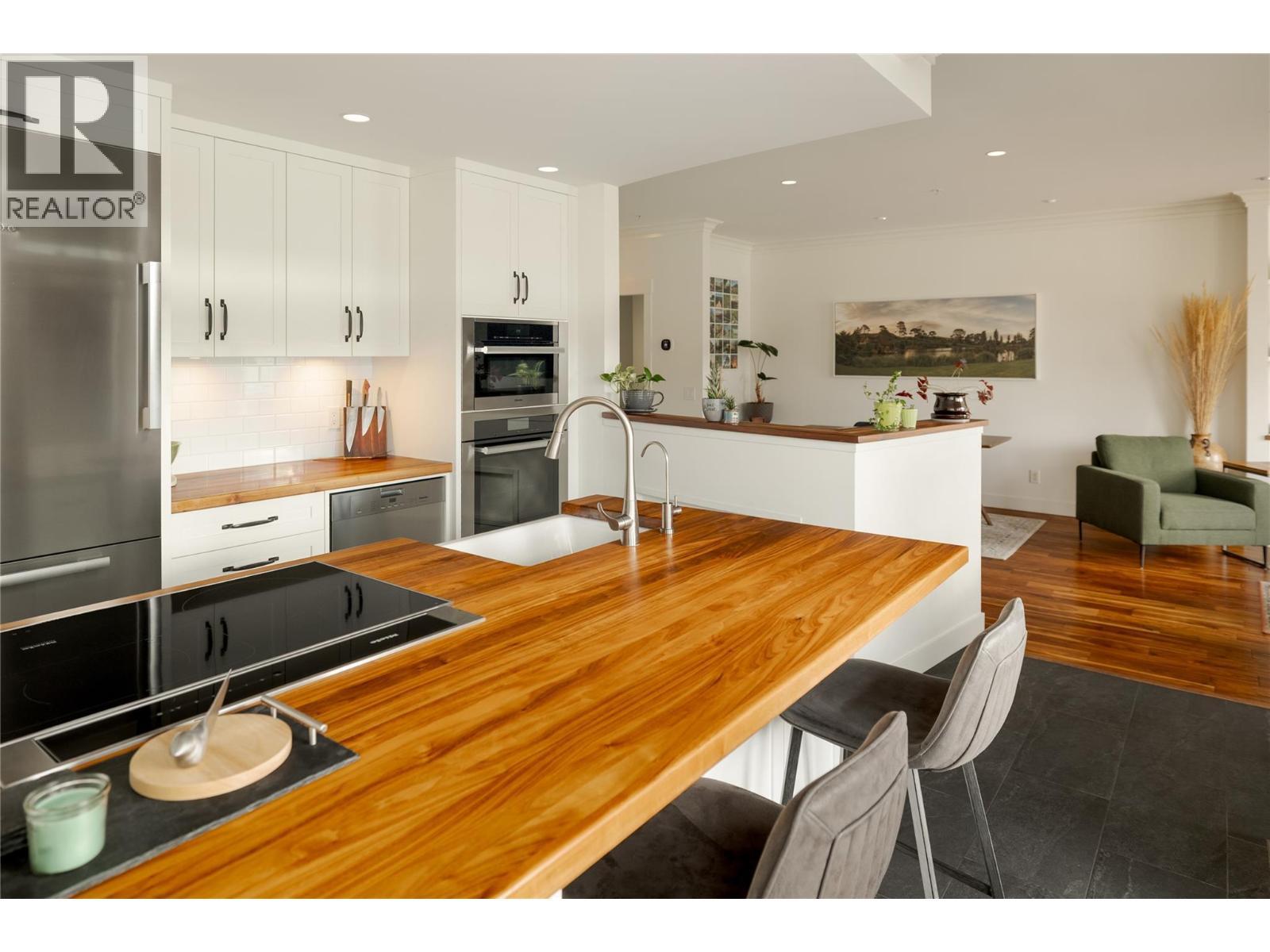 Mornings here begin with a short walk to the shoreline — coffee in hand, paddleboard tucked under your arm, the lake just steps from your door. Positioned directly across from the water in one of the city’s most sought-after waterfront corridors, this extensively renovated townhome was thoughtfully redesigned for both comfort and connection. The main living spaces are elevated on the upper level, where natural light pours through expansive windows and the rhythm of daily life unfolds. The kitchen was completely reimagined to be both beautiful and highly functional. Commercial-grade black walnut countertops bring warmth and depth, complemented by custom cabinetry with soft-close hardware and a full Miele appliance package. Whether preparing a quiet dinner or hosting friends after a day at the beach, the space feels intentional and inviting. The living area centres around a sleek fireplace framed by custom built-ins, creating a welcoming atmosphere year-round. From here, step onto the generous west-facing deck with retractable awning— a favourite place to unwind as the afternoon light softens. Downstairs, the home shifts into retreat mode. All bedrooms are located on the walk-out level, offering privacy and separation from the main entertaining areas above. The primary suite has been fully redesigned with a custom walk-through closet and spa-inspired ensuite featuring heated floors, heated towel bar and mirror, slate tile, vessel sink, and a multi-spray tiled shower. A second bedroom and flexible den allow space for guests, work, or creative pursuits. The lower patio includes storage for paddleboards and kayaks — making it easy to decide on a spontaneous evening paddle, while secure parking and storage unit provide convenience. This home is designed for those who value simplicity, quality, and a lifestyle that unfolds just beyond the front door. (id:6769)