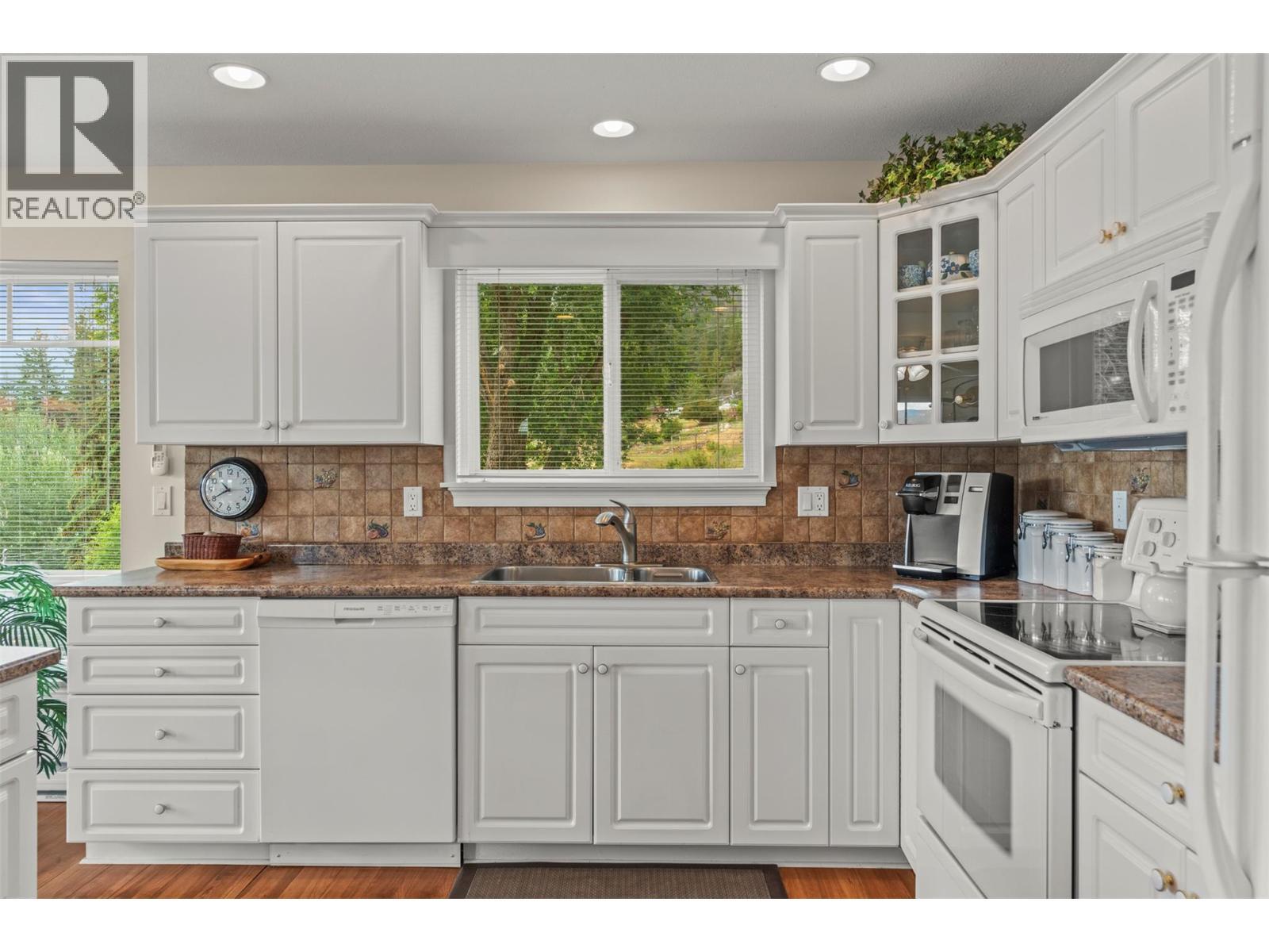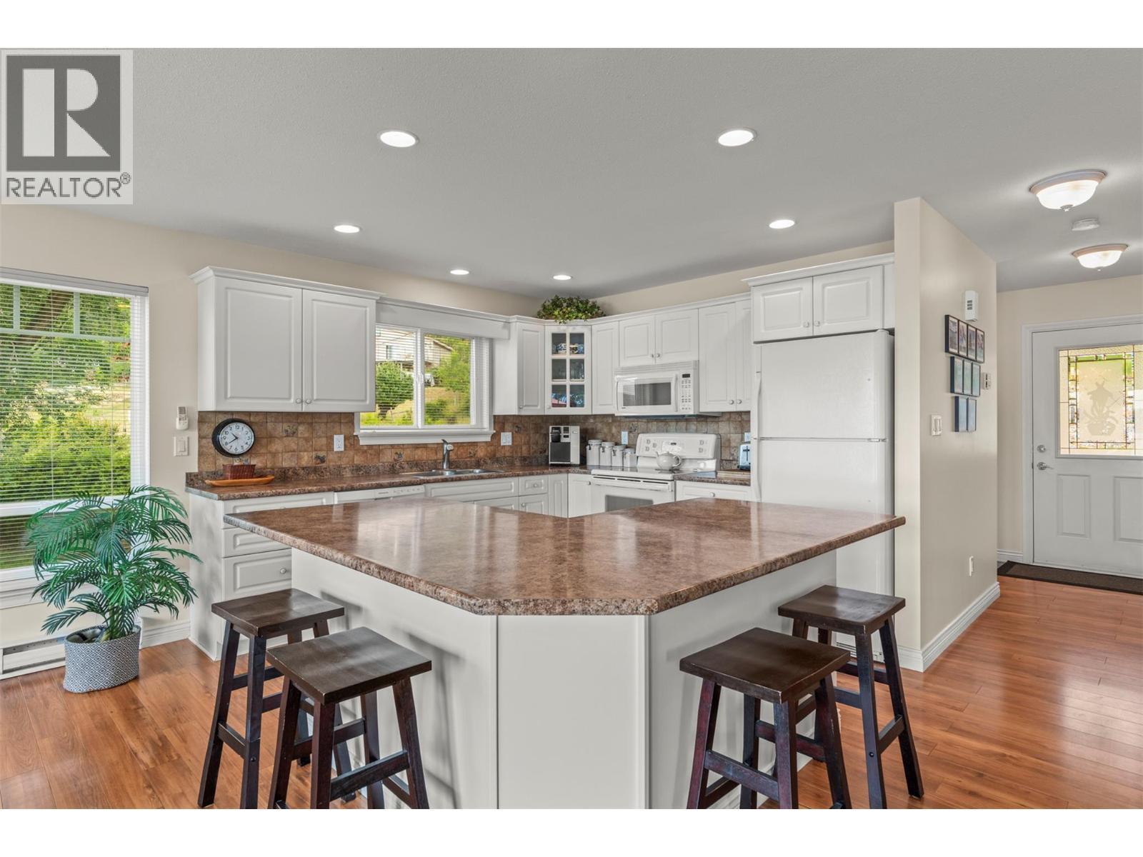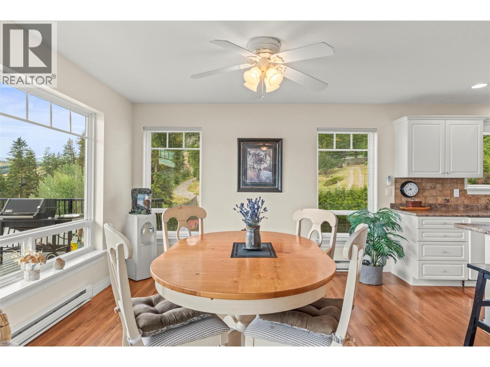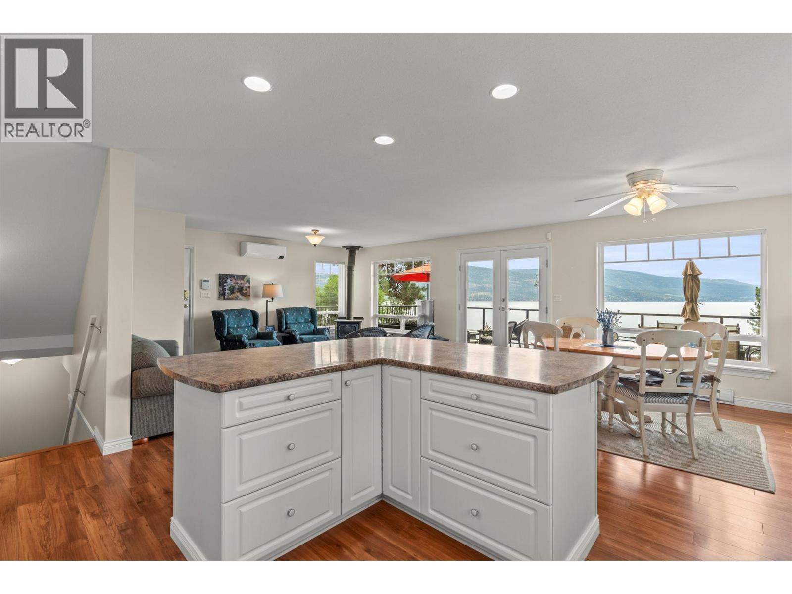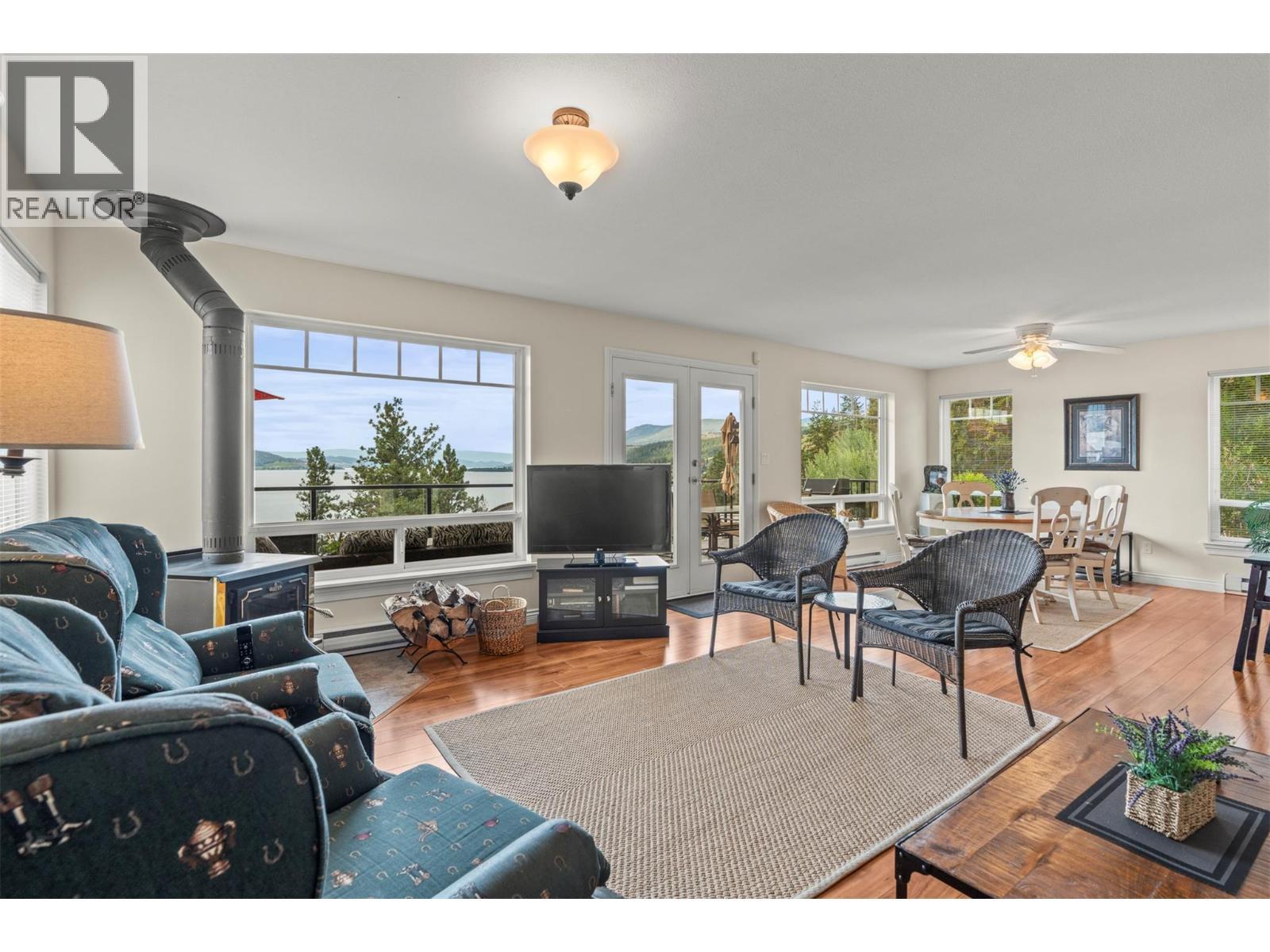 Welcome to your dream lakeview retreat! This well-maintained family home is perfectly perched to capture breathtaking expansive views of the lake from all three levels, with large south-facing windows and multiple decks to soak in the scenery. Whether you're sipping coffee on the upper balcony or enjoying a sunset by the fire pit, the views are truly unmatched. Inside, the layout is both functional and flexible. The main floor features an open-concept kitchen and dining area, seamlessly flowing into a cozy living room with a wood fireplace and walkout to a spacious deck. A full 3-piece bathroom and bedroom complete the main level. Upstairs, the oversized primary suite offers a true retreat with a sitting area, skylit 4-piece ensuite with soaker tub, and private balcony. A second bedroom with 2-piece ensuite is located across the hall. The fully finished walk-out lower level includes two additional bedrooms, a full bath, kitchen and laundry—ideal for an in-law suite or mortgage helper.Outside, enjoy ample parking including RV/boat space, a carport, mature fruit trees, a shed for garden tools, and a welcoming neighbourhood vibe. You’re just 5 minutes to the public beach and boat launch and only 10 minutes to Fintry Park. This is lake life at its best, flexible, scenic, and full of possibility. (id:6769)