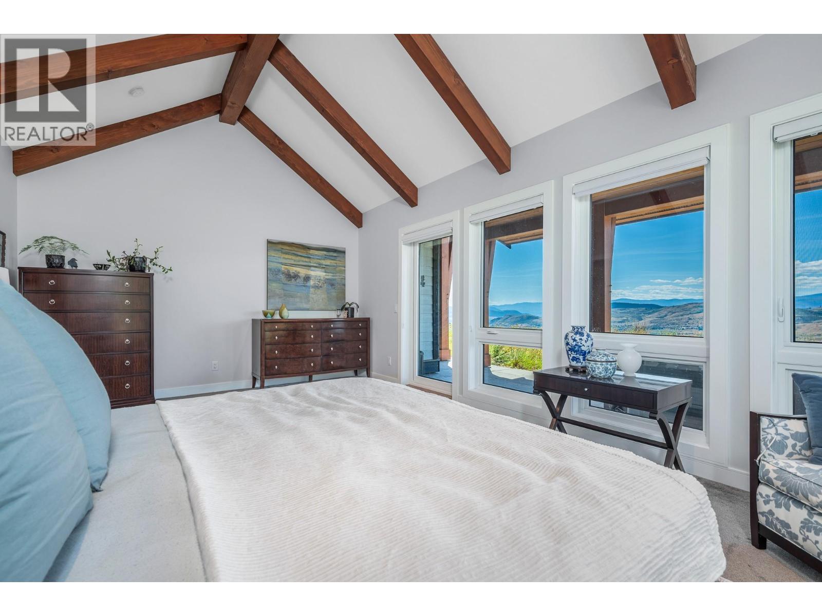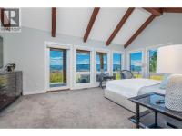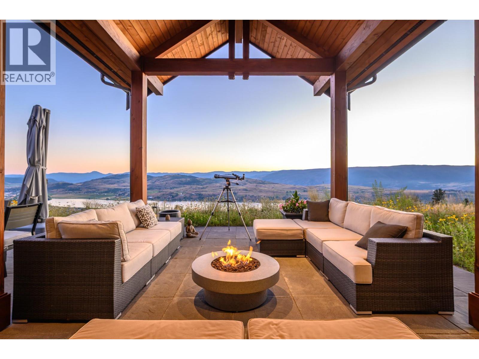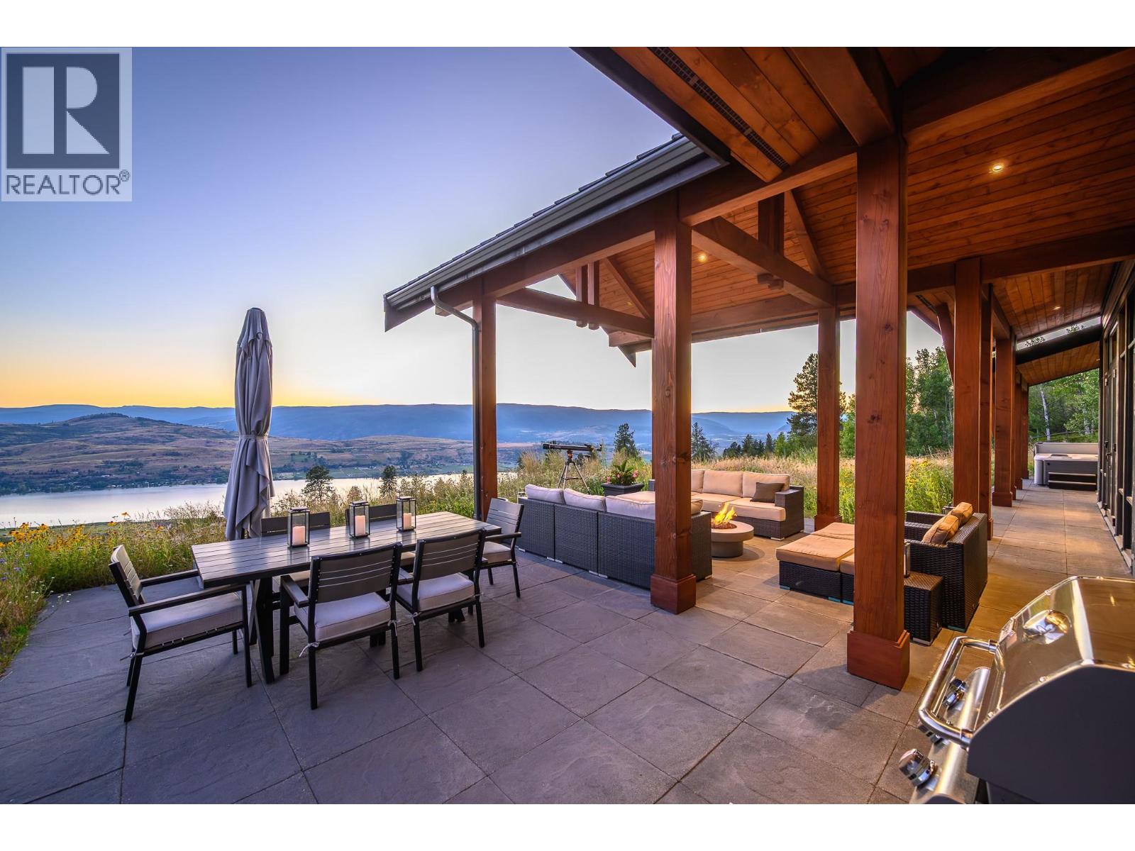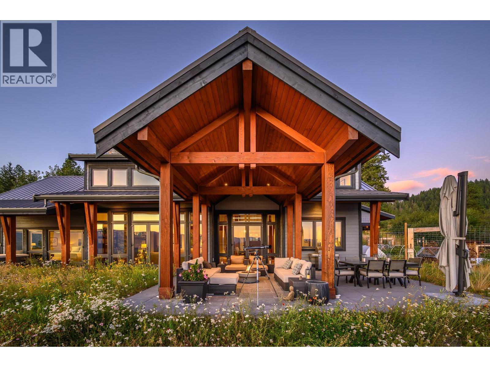 Set high on nearly 5 acres of gently sloped hillside, this private estate captures sweeping south-west views of the Okanagan Valley with no immediate neighbours. Built in 2021 by Gibsons, this level-entry timber frame residence showcases striking structural Douglas fir beams and tongue-and-groove ceilings, complemented by a high-efficiency modern wood-burning fireplace. Designed for both comfort and longevity, the home offers 4 bedrooms and 2.5 baths, with the primary suite on the main level and additional bedrooms upstairs. Soaring 23’ ceilings elevate the principal living space, while engineered hardwood, honed granite, Hunter Douglas window coverings, and a Wolf gas cooktop with premium appliances complete the interior. Mechanical systems are exceptional: geothermal heating and air conditioning with 3-zone climate control, steam humidifier for beam preservation, RO water filtration (well-fed), recirculation pumps, Generac transfer switch wired for a backup generator, and full security system. Outdoors features include a 3-bay pull-through garage, lifetime tin roof, fully irrigated grounds, hot tub, outdoor shower, and extensive fire protection with a 30,000-gallon reservoir, hydrant, and 200’ spooled fire hose. A rare blend of craftsmanship, privacy, and engineered excellence. All measurements approximate, verify if important. (id:6769)