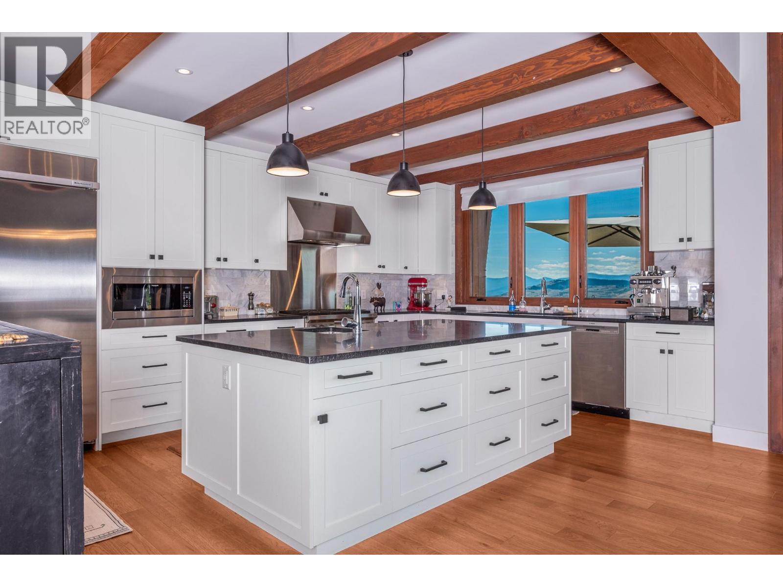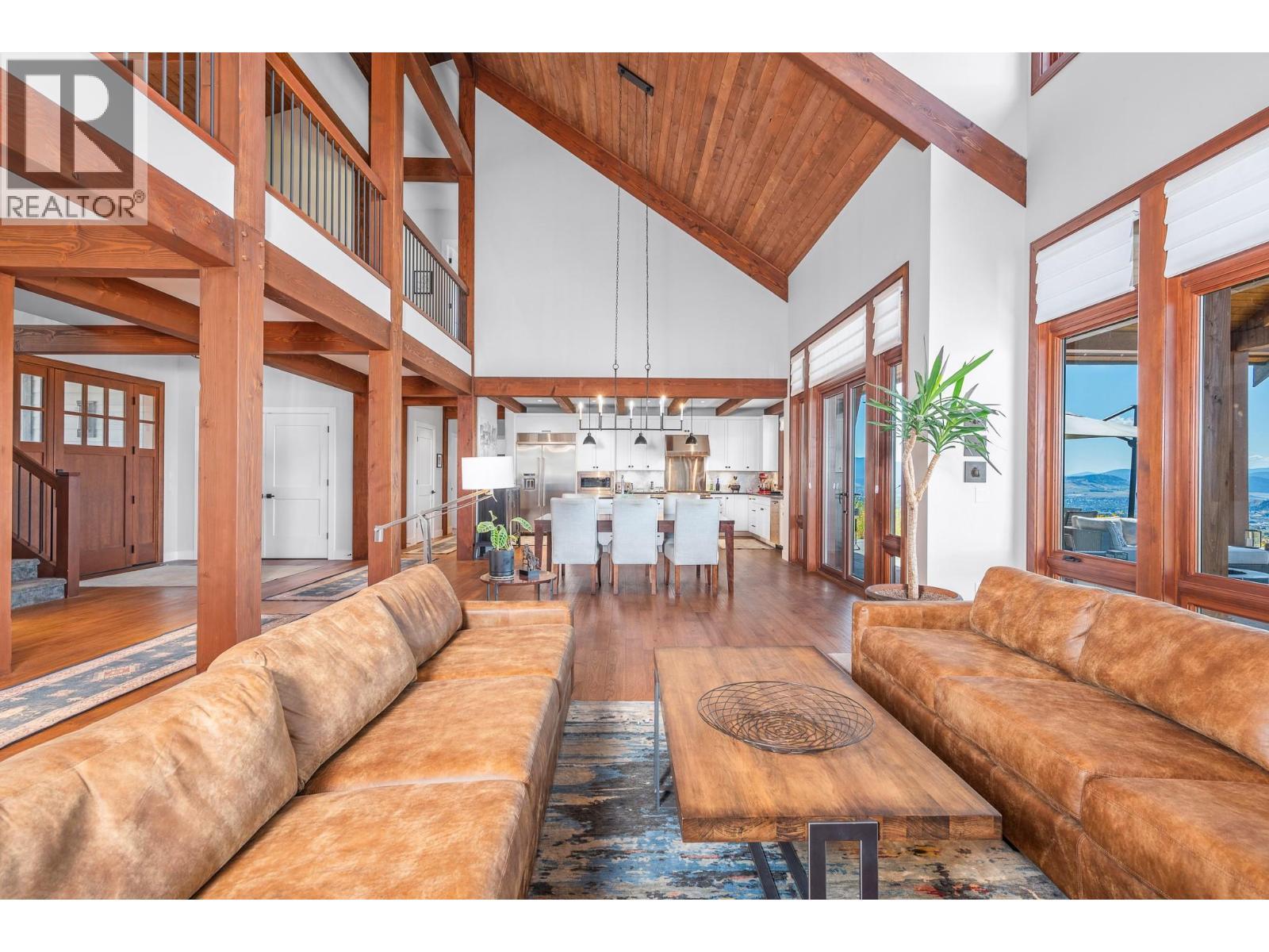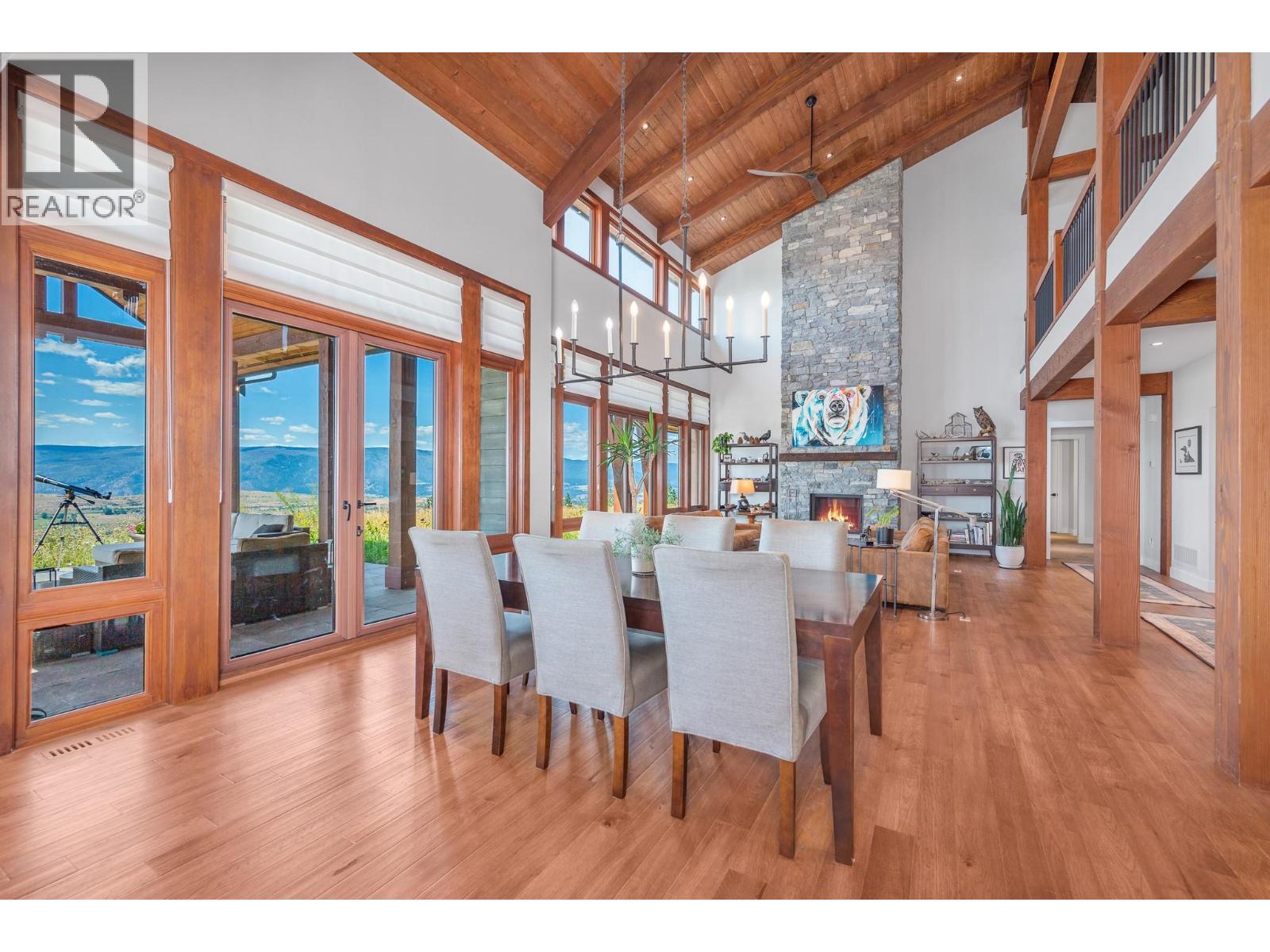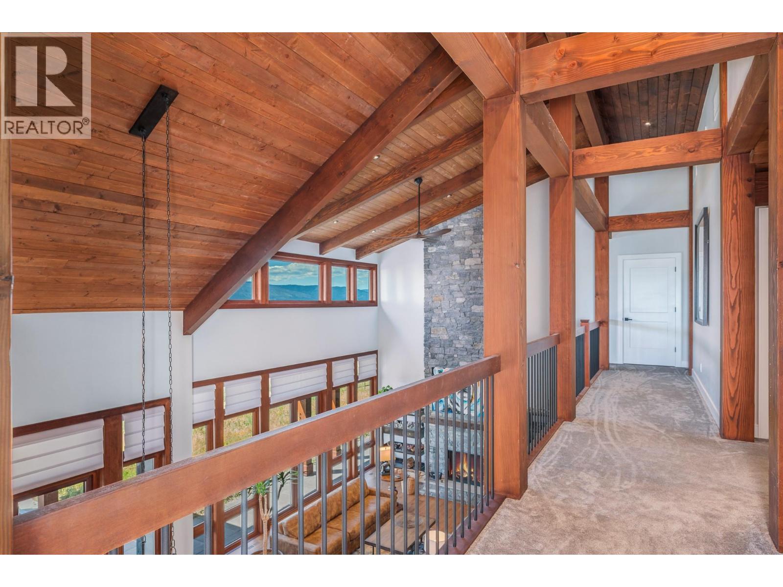 Set high on nearly 5 acres of gently sloped hillside, this private estate captures sweeping south-west views of the Okanagan Valley with no immediate neighbours. Built in 2021 by Gibsons, this level-entry timber frame residence showcases striking structural Douglas fir beams and tongue-and-groove ceilings, complemented by a high-efficiency modern wood-burning fireplace. Designed for both comfort and longevity, the home offers 4 bedrooms and 2.5 baths, with the primary suite on the main level and additional bedrooms upstairs. Soaring 23’ ceilings elevate the principal living space, while engineered hardwood, honed granite, Hunter Douglas window coverings, and a Wolf gas cooktop with premium appliances complete the interior. Mechanical systems are exceptional: geothermal heating and air conditioning with 3-zone climate control, steam humidifier for beam preservation, RO water filtration (well-fed), recirculation pumps, Generac transfer switch wired for a backup generator, and full security system. Outdoors features include a 3-bay pull-through garage, lifetime tin roof, fully irrigated grounds, hot tub, outdoor shower, and extensive fire protection with a 30,000-gallon reservoir, hydrant, and 200’ spooled fire hose. A rare blend of craftsmanship, privacy, and engineered excellence. All measurements approximate, verify if important. (id:6769)