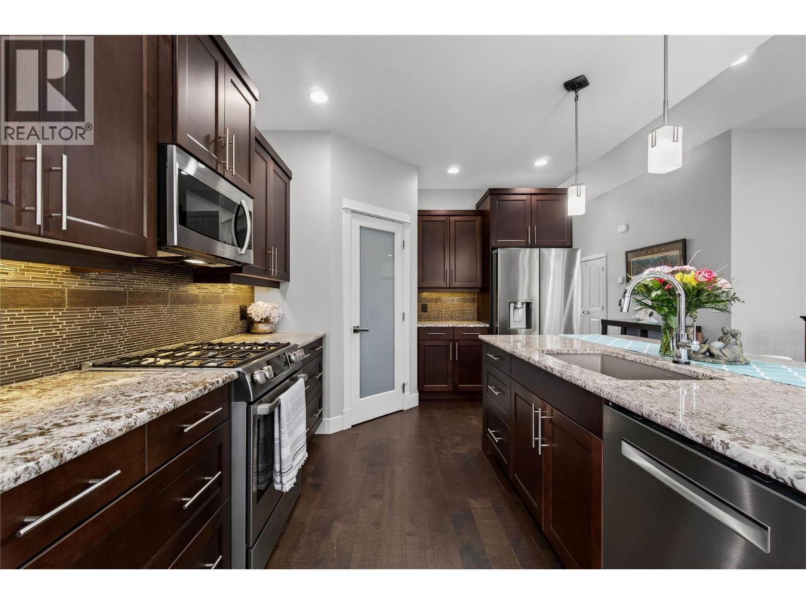 Welcome to this walk-out Rancher at The Lakes. Whether you have a family, are a young professional or looking to simplify as an empty nester, this home offers space to grow into or retire in. At approximately 3,000 sq ft, the main floor is open & bright with vaulted ceilings & oversized windows bringing in natural light & views. A stand-out feature of this home is its sense of space & privacy. Rather than backing onto other homes, the property looks out to trees with mountain views beyond the back fence which leads to the playground & basketball court. The covered balcony extends the living area outdoors & is the backdrop to enjoying warm Okanagan days & relaxed evenings. The Lakes is known for its welcoming community feel, ideal for families or those settling into a quieter pace of life. Active living is right outside your door with the Okanagan Rail Trail nearby for walking, running or cycling & three lakes — Kalamalka, Wood & Okanagan — offering opportunities to paddle, cruise, fish or surf. Hiking Spion Kop is accessible from the neighborhood & the beach is only minutes away. Bus stops are very close & Turtle Bay Crossing offers everyday amenities. New AC 2025, new toilets, paint & all carpets/underlay replaced in 2022. The basement has roughed-in plumbing for a kitchen or wet bar & the back yard could accommodate a pool & hot tub. A well-located home offering views & easy access to the Okanagan lifestyle. Click BROCHURE for more information on the home & community. (id:6769)